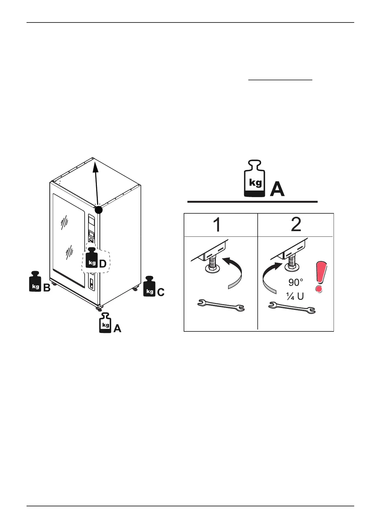 • Exert strong pressure on the corner at F2 while manually unscrewing foot A until it touches the oor.