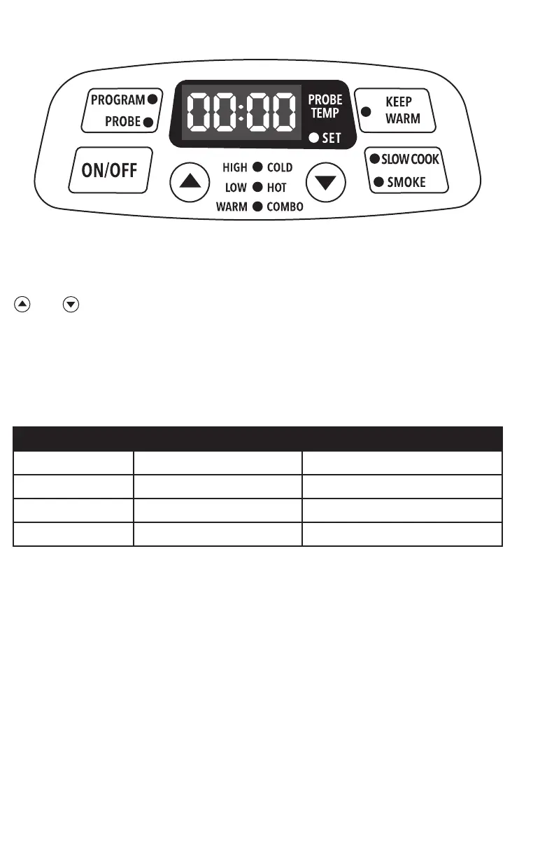 and Buttons: Use to adjust cooking time, desired temperature, slow cook heat