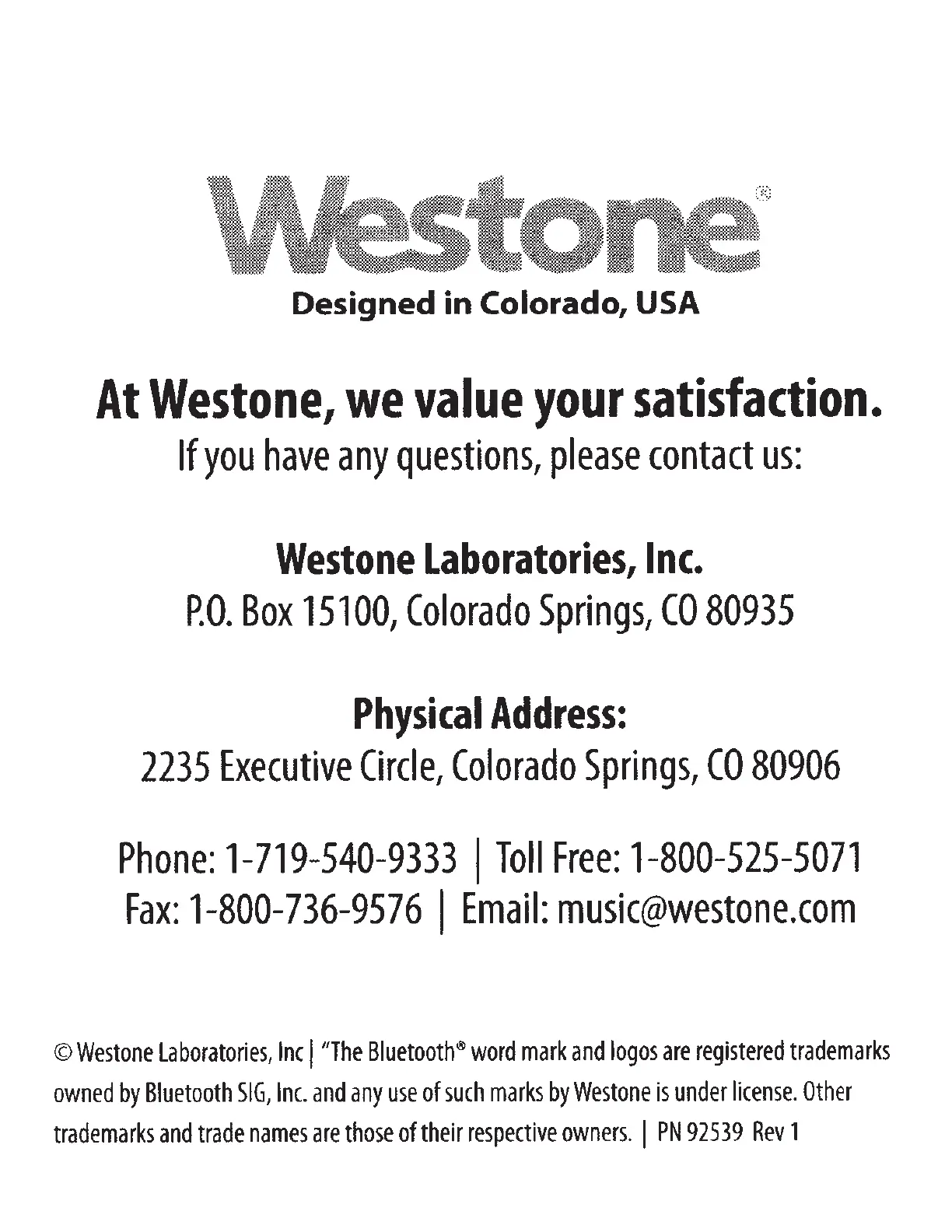 Westone Bluetooth Cable - Contact and Legal Information; Westone Contact Details; Trademark and Licensing Notice