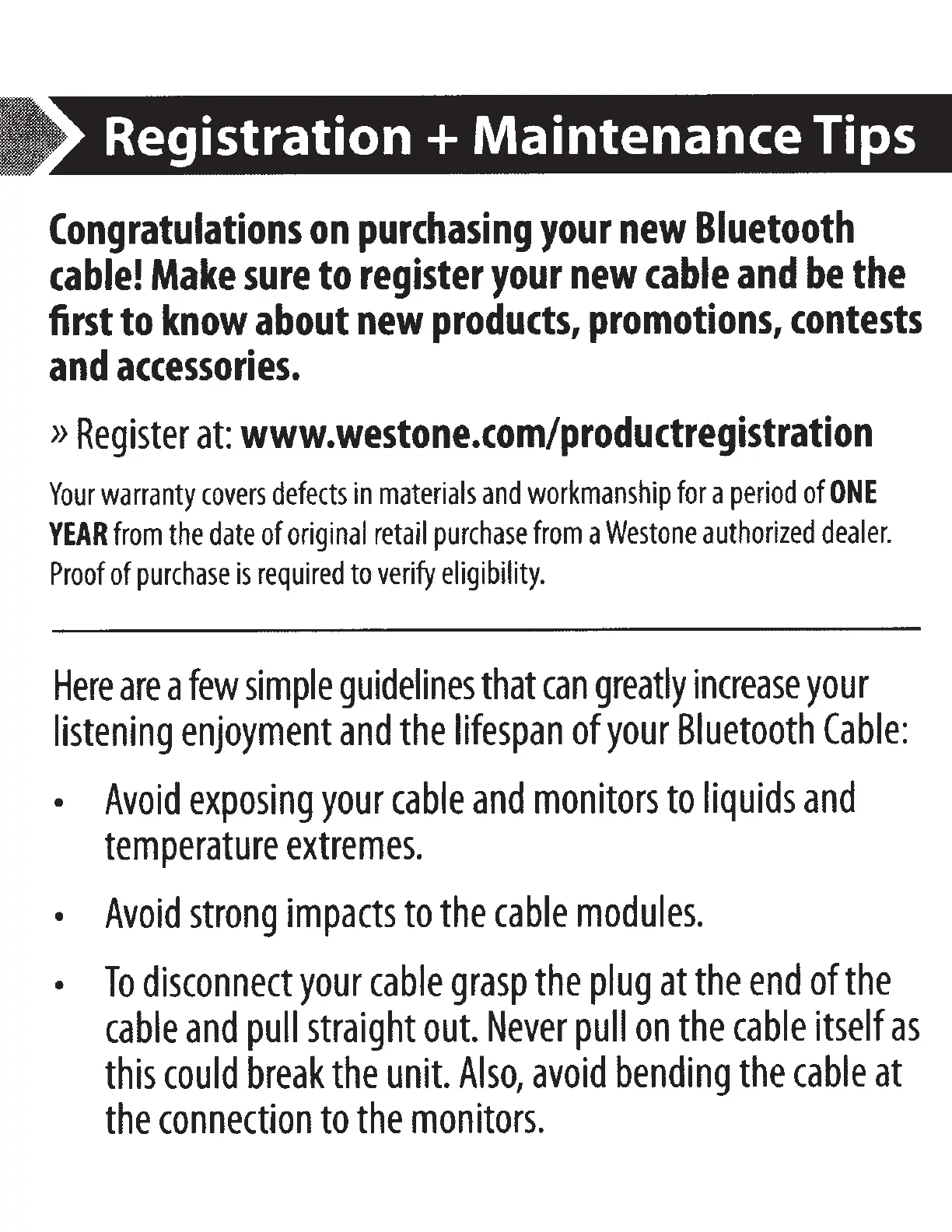 Westone Bluetooth Cable - Registration and Maintenance; Product Registration; Maintenance Guidelines