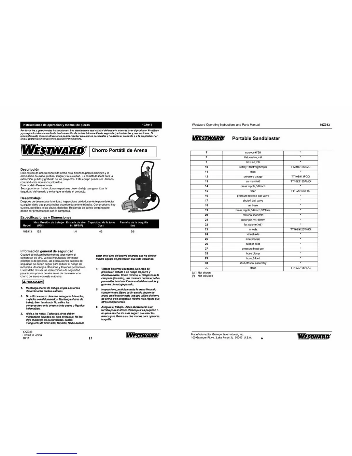 Westward 10Z913 - Safety Precautions and Component Inspection; Wear Protective Gear; Inspect Sand Components; Secure the Work