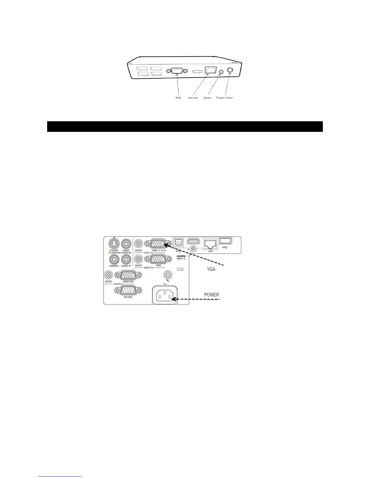 The image below illustrates where to place the VGA and power cable on our standard projector: