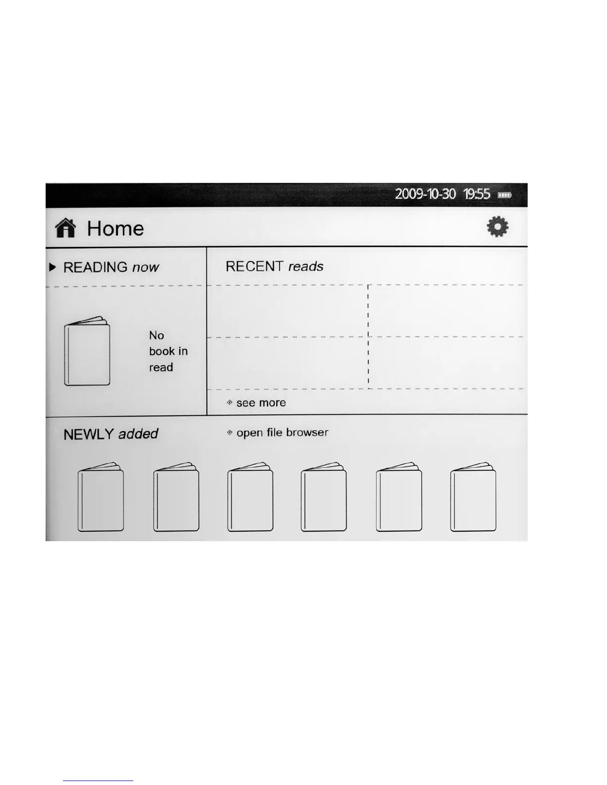 1. Using control buttons, you can select one of five options: ««Settings», «Readnow», «Last Read », «Open file