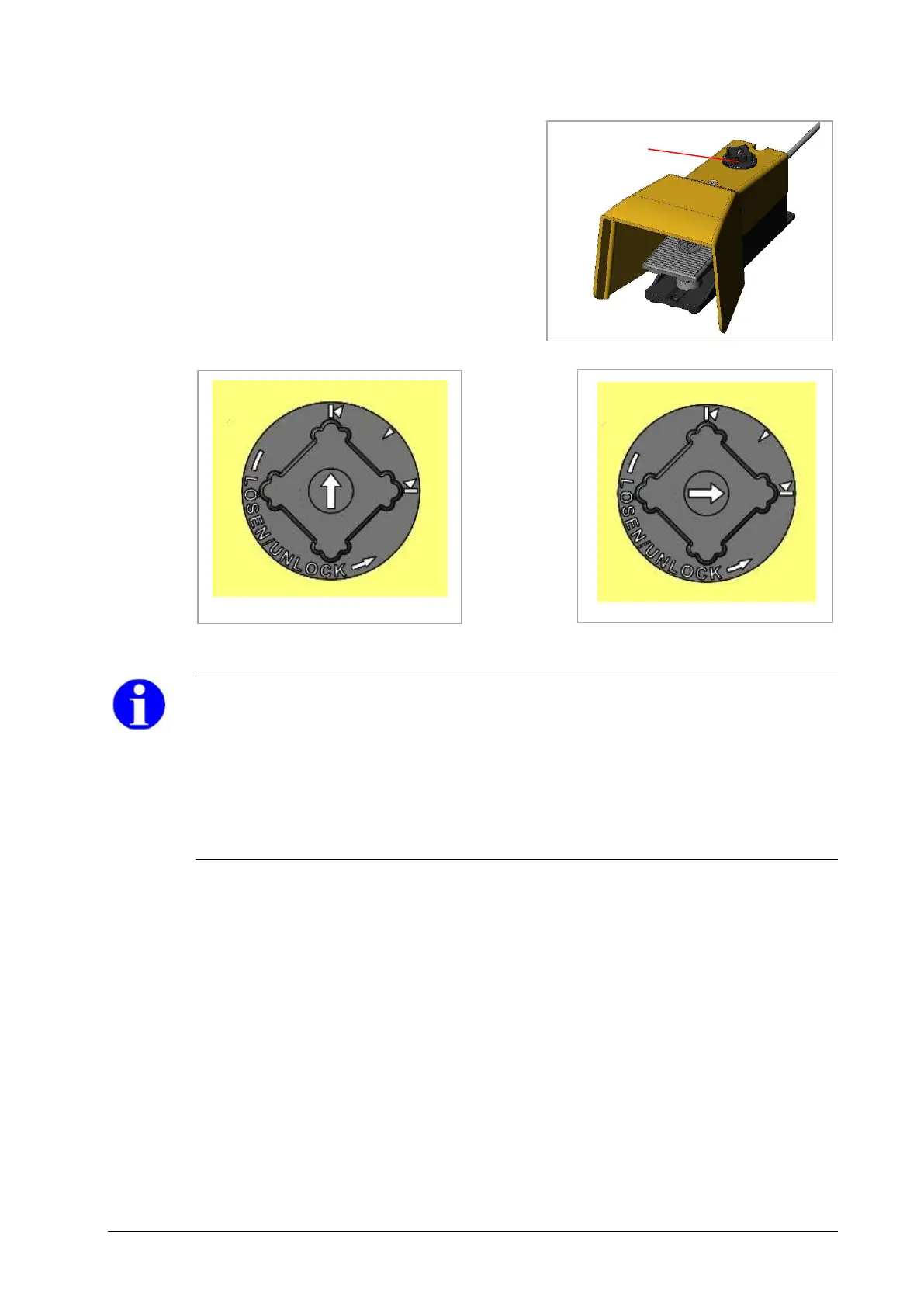 + Over pressing the foot pedal will trip the safety lock. It will rotate to the 3 o’ clock position