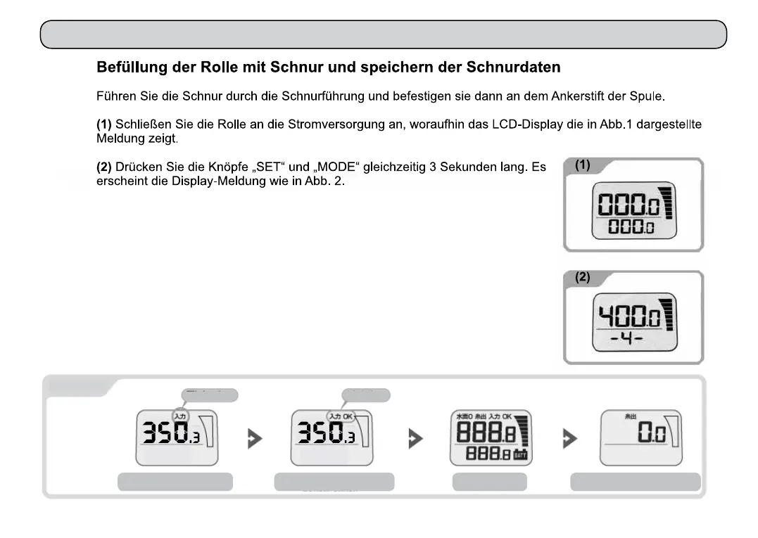 Schnur ist aufgespult MODE Knopf drücken Initialisierung Schnurdaten gespeichert