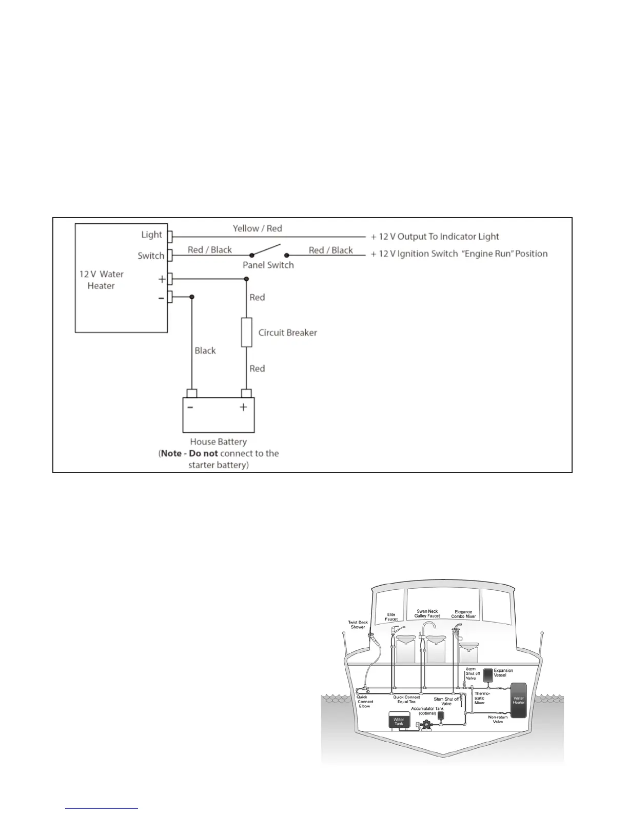 circuit breaker is installed between the water heater and auxiliary battery prior to use. This will protect the system from