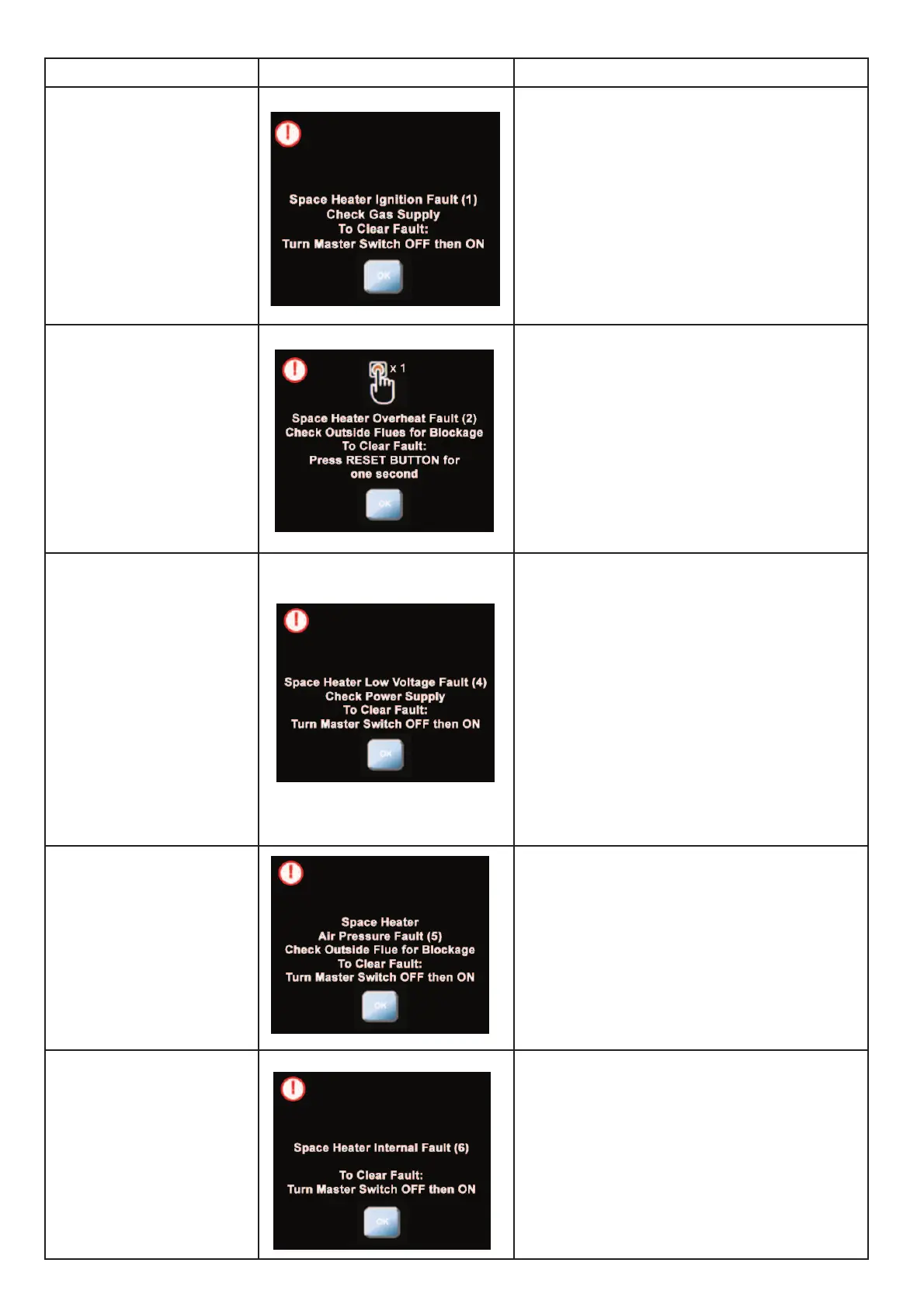 Tabelle 6: Fehlerbildschirmanzeigen Raumluftheizgerät