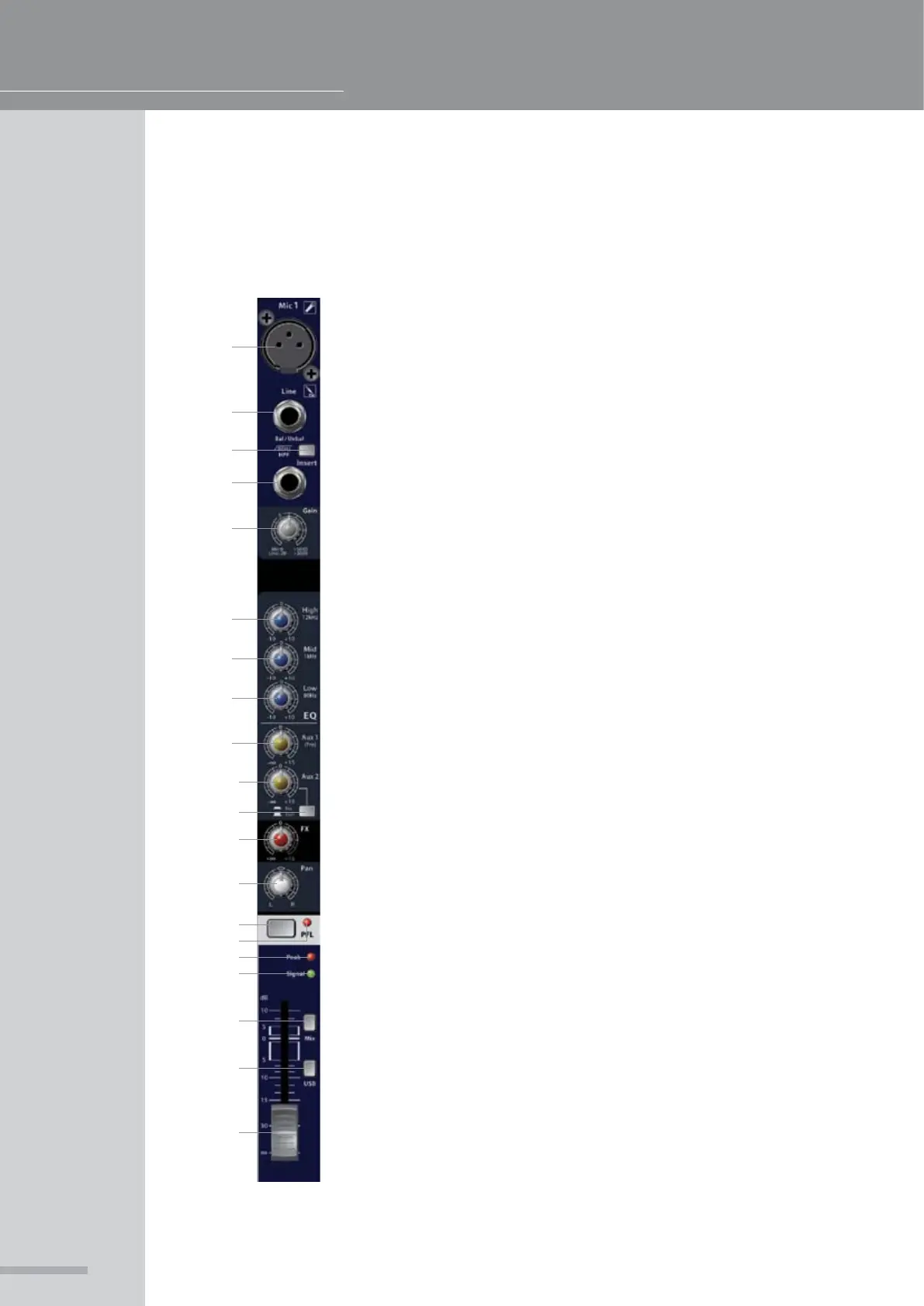 14. (Pre Fade Listen) allows you to set the channel gain and monitor the