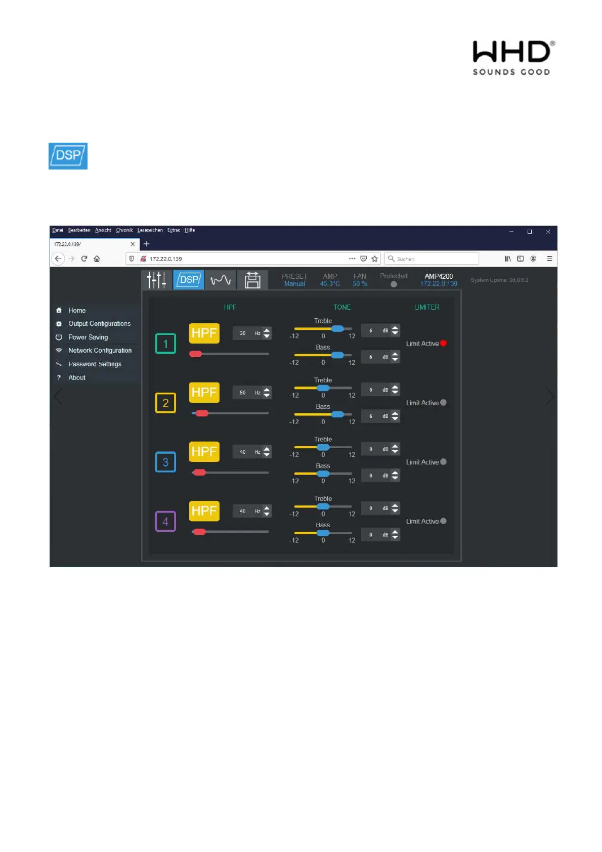 A high-pass filter and a simple bass / tweeter control can be carried out for each output.