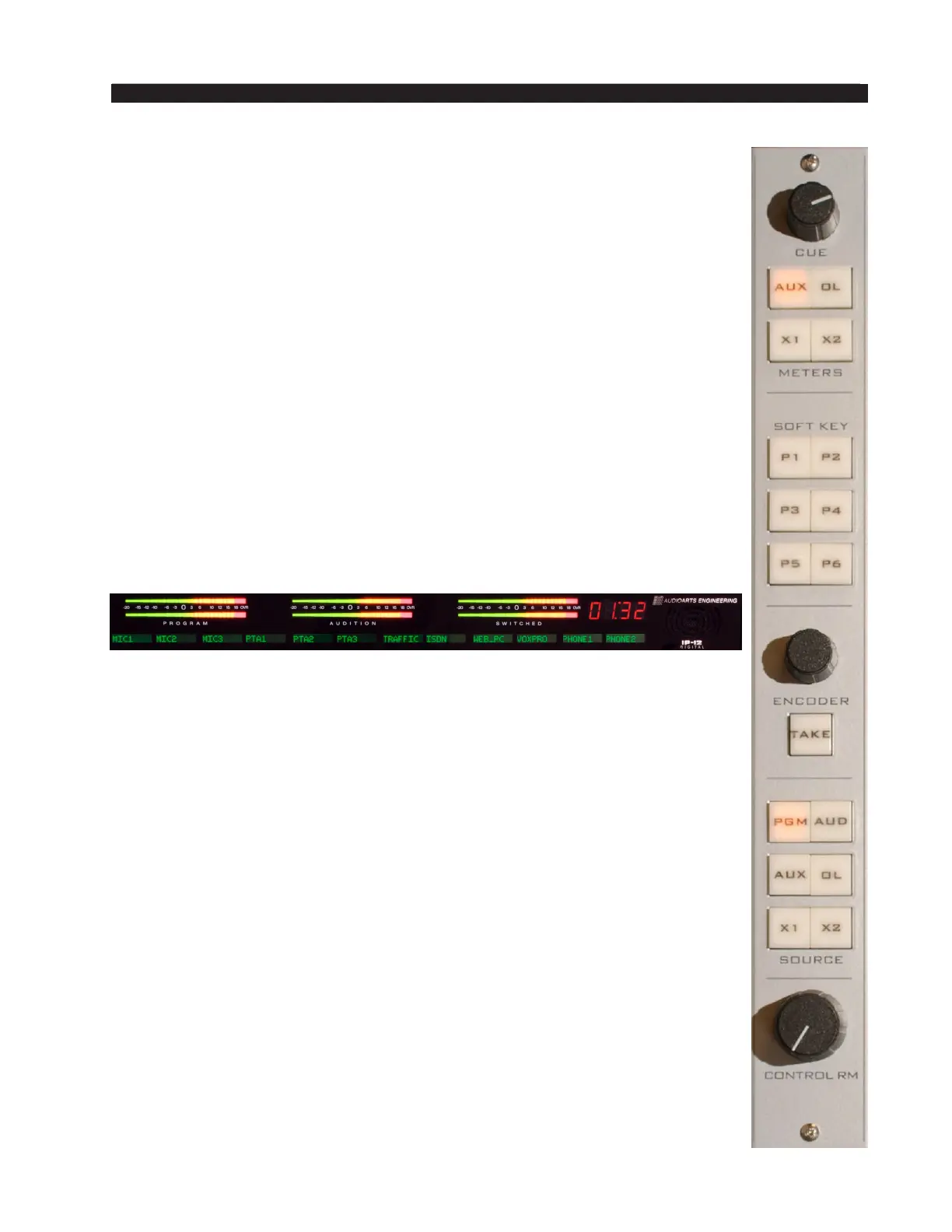VU meter pairs (PROGRAM, AUDITION, and SWITCHED) are stereo