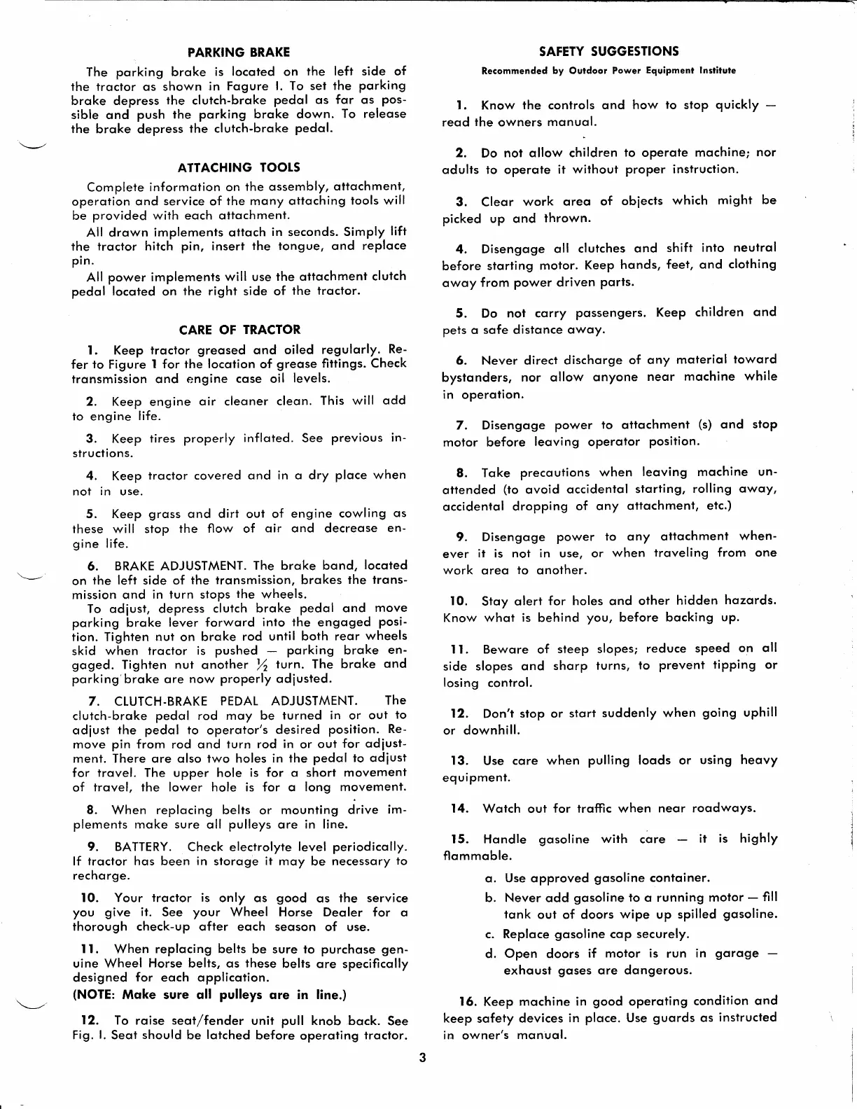 Wheel Horse COMMANDO 6 - Parking Brake; Attaching Tools; Safety Suggestions
