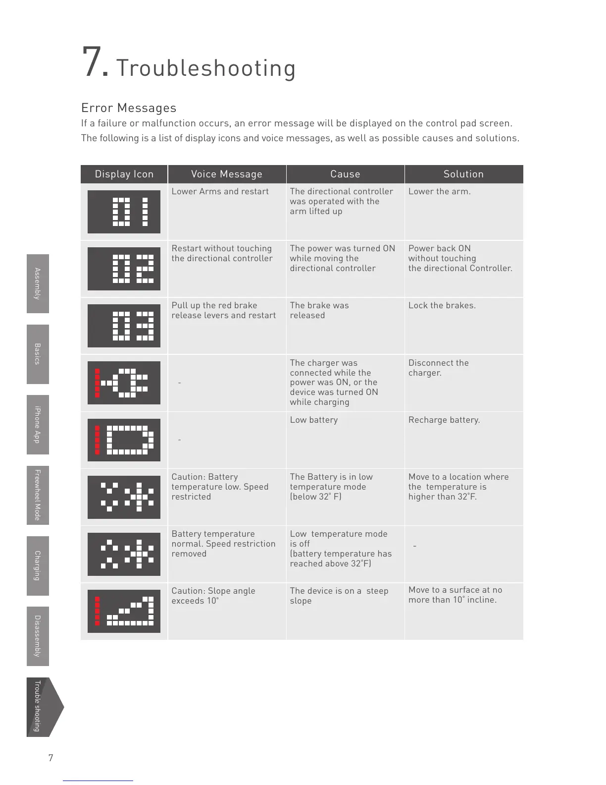 The following is a list of display icons and voice messages, as well as possible causes and solutions.