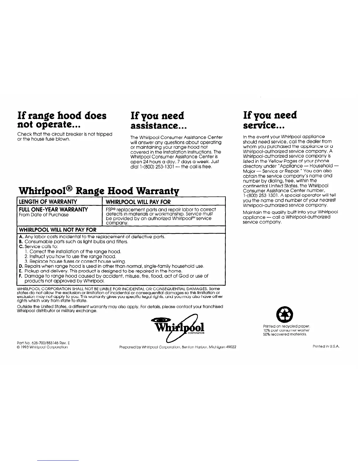 WHIRLPOOL CORPORATION SHALL NOT BE LIABLE FOR INCIDENTAL OR CONSEQUENTIAL DAMAGES. Some