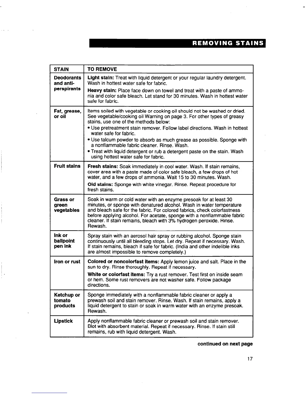 Fresh stains: Soak immediately in cool water. Wash. If stain remains,