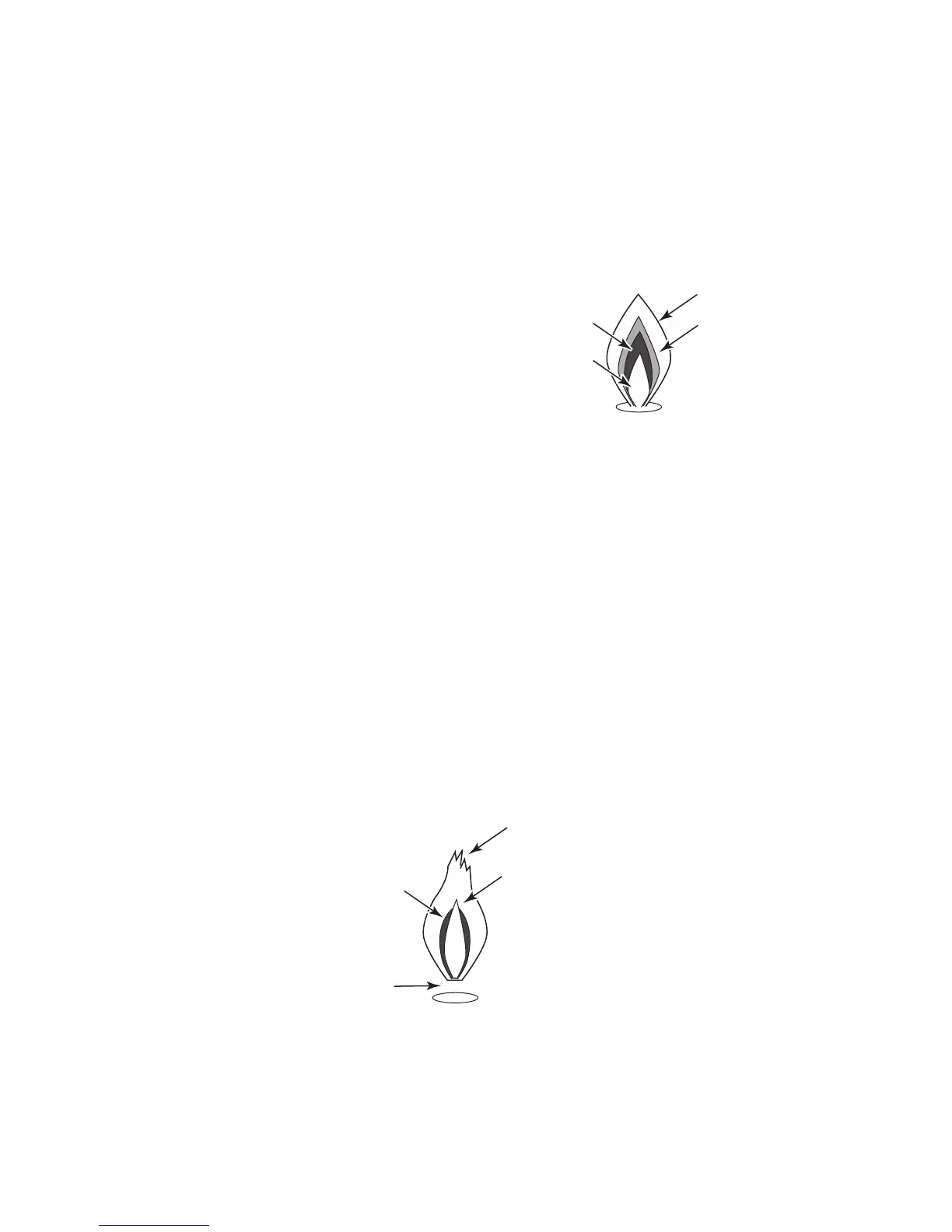 A properly burning flame has an inner cone, an outer cone, and an outer envelope. These three
