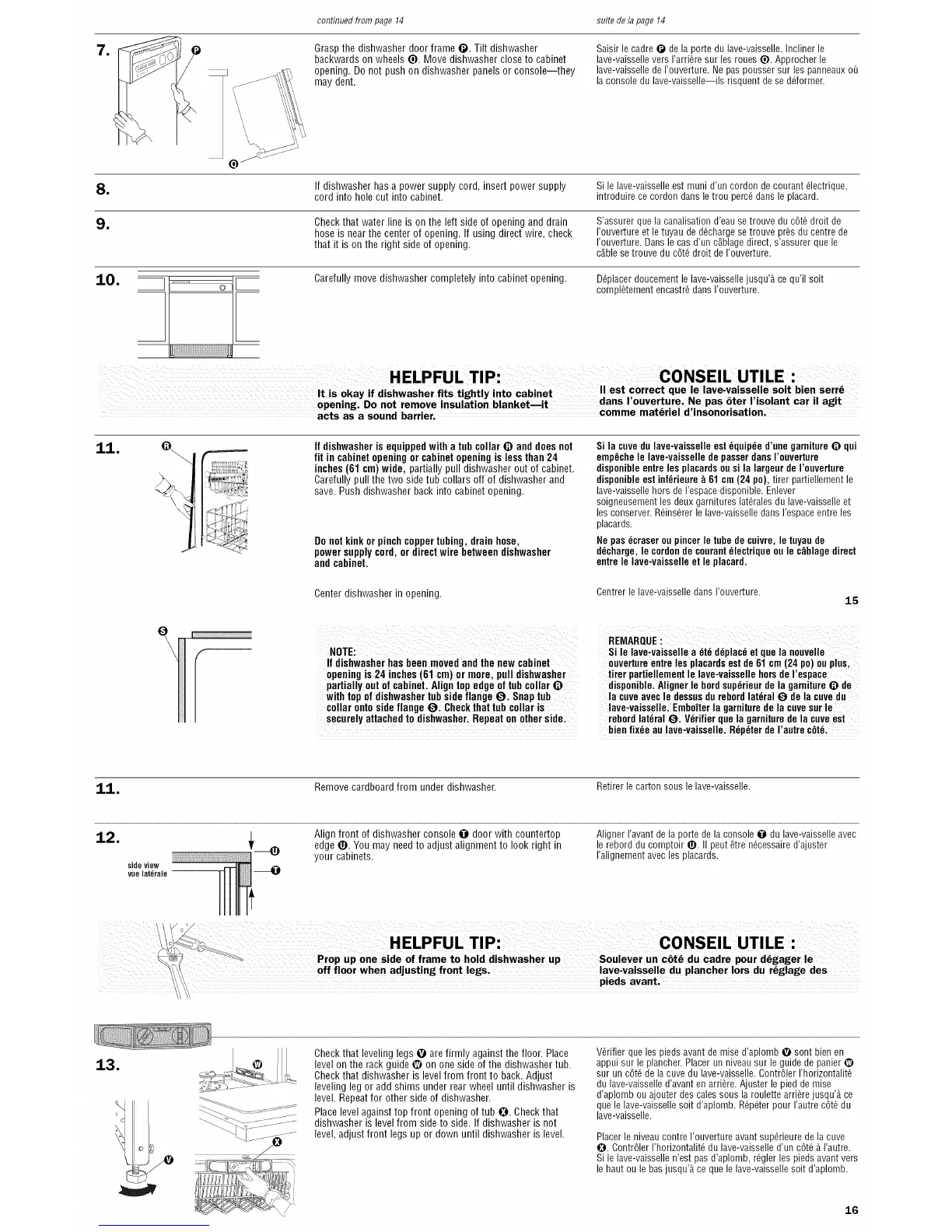 O. Contr61erI'horizontalit6 du lave-vaisselled'un c6t6 _ I'autre.