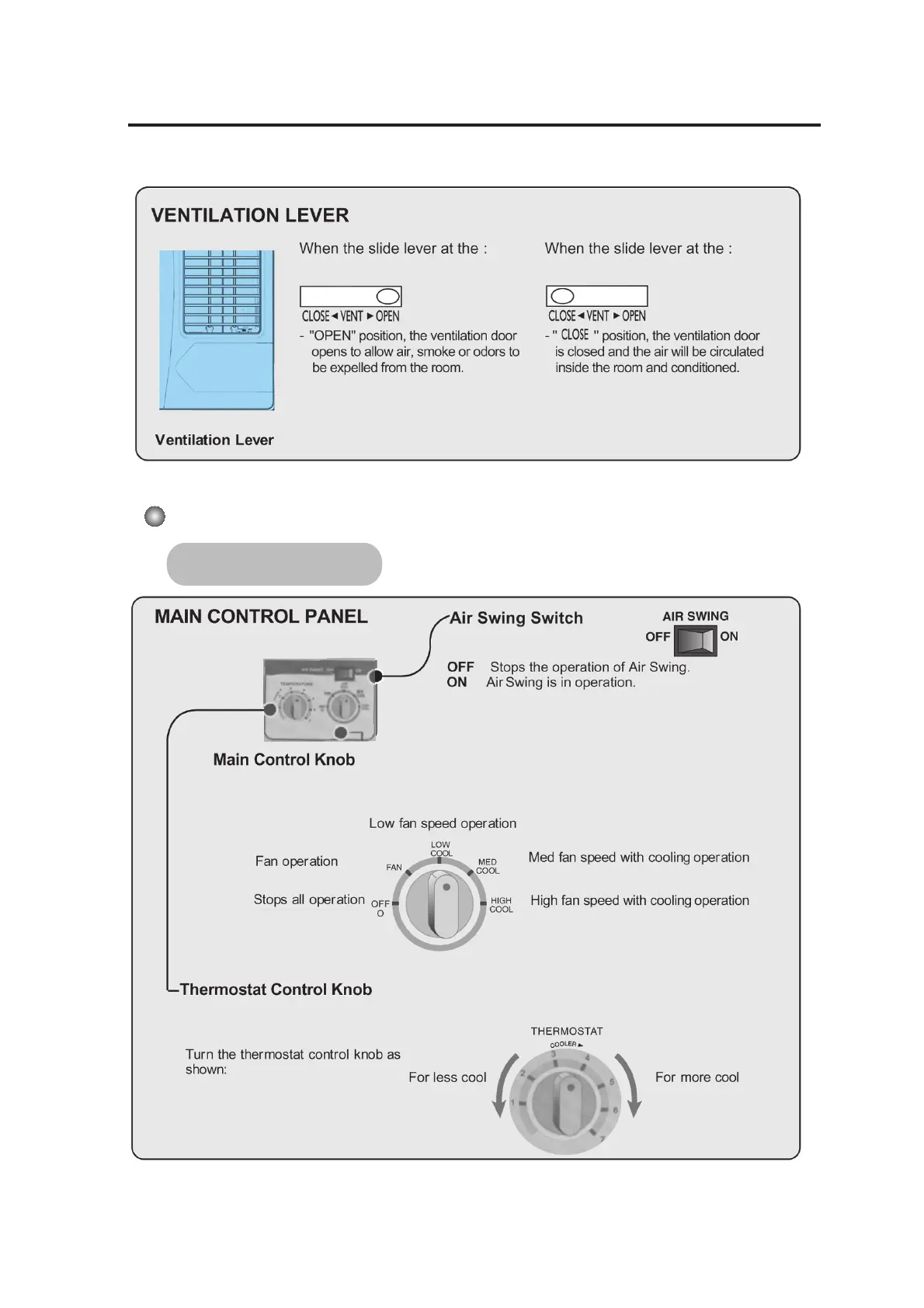 Whirlpool AC1888 - Ventilation Lever Operation; Air Conditioner Operation (Mechanical); Main Control Panel Overview