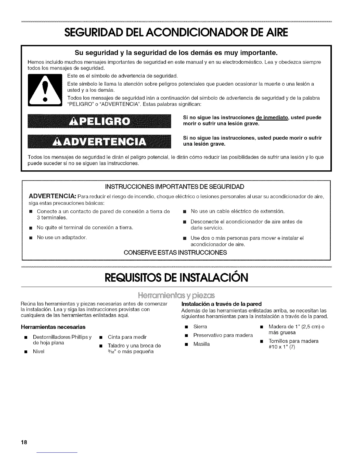 ADVERTENCIA: Para reducir el riesgo de incendio, choque electrico o lesiones personales al usar su acondicionador de aire,
