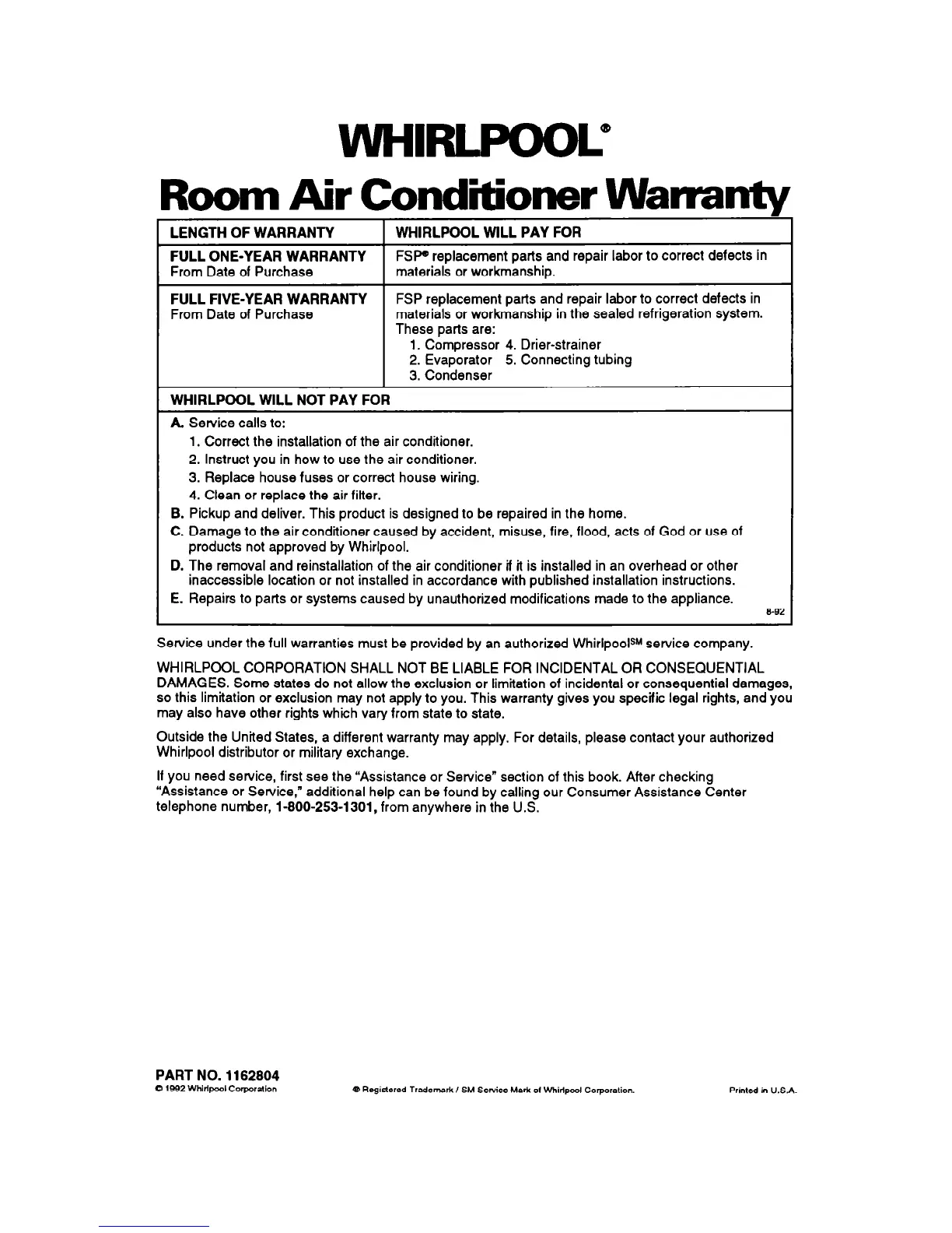 WHIRLPOOL CORPORATION SHALL NOT BE LIABLE FOR INCIDENTAL OR CONSEQUENTIAL