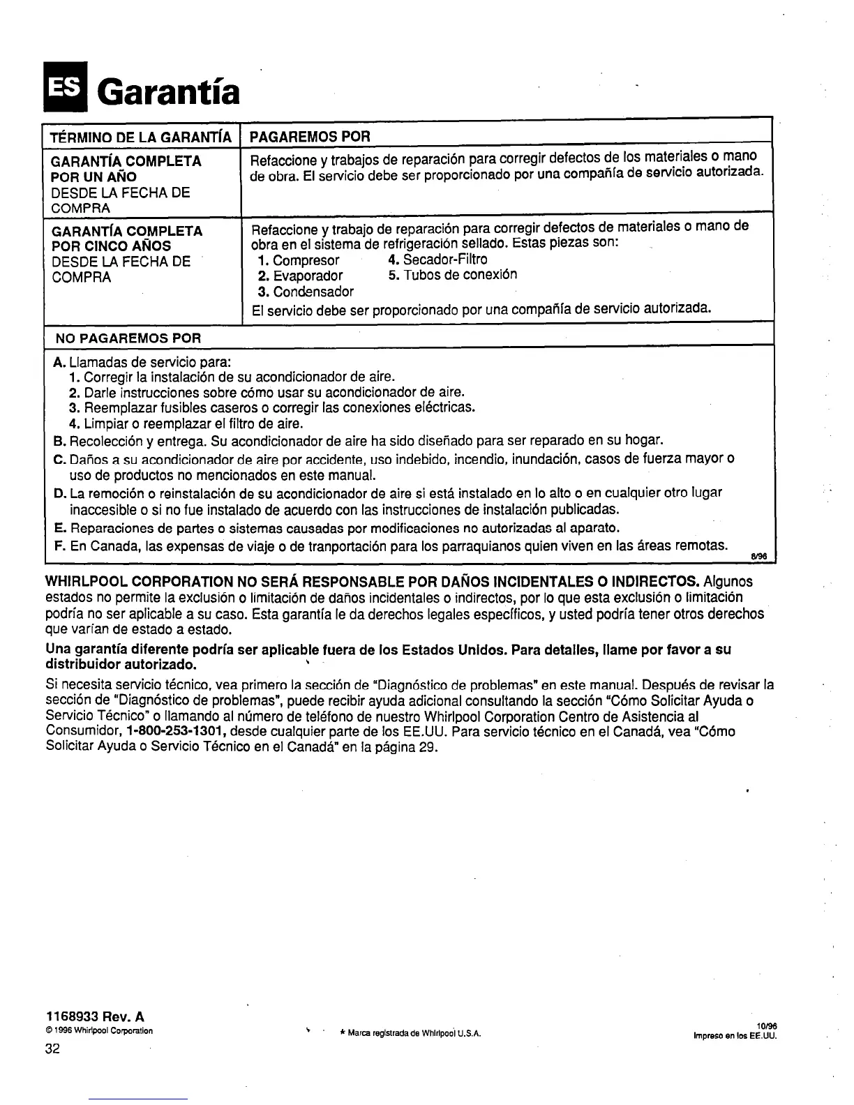 Servicio Tecnico” o llamando al ntimero de telefono de nuestro Whirlpool Corporation Centro de Asistencia al