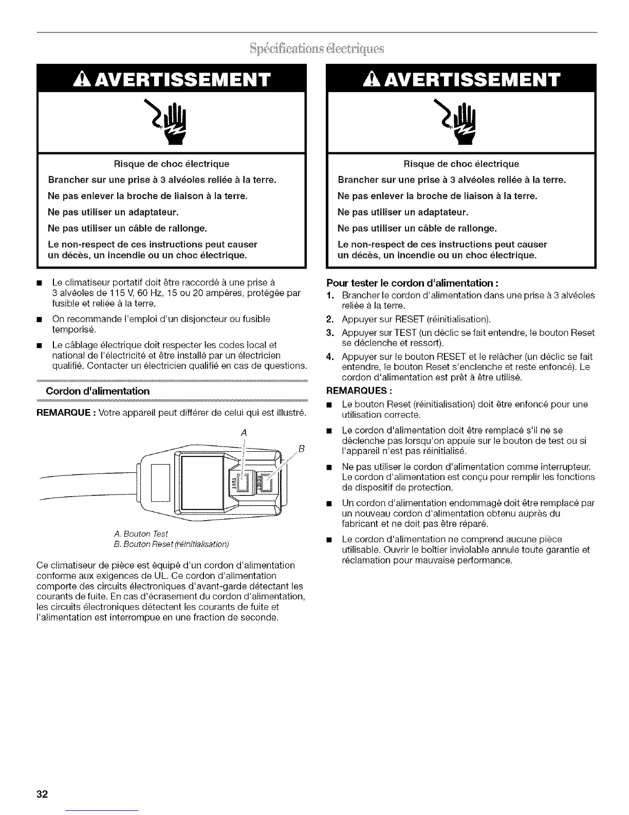 • Le cordon d'alimentation dolt _tre remplace s'il ne se