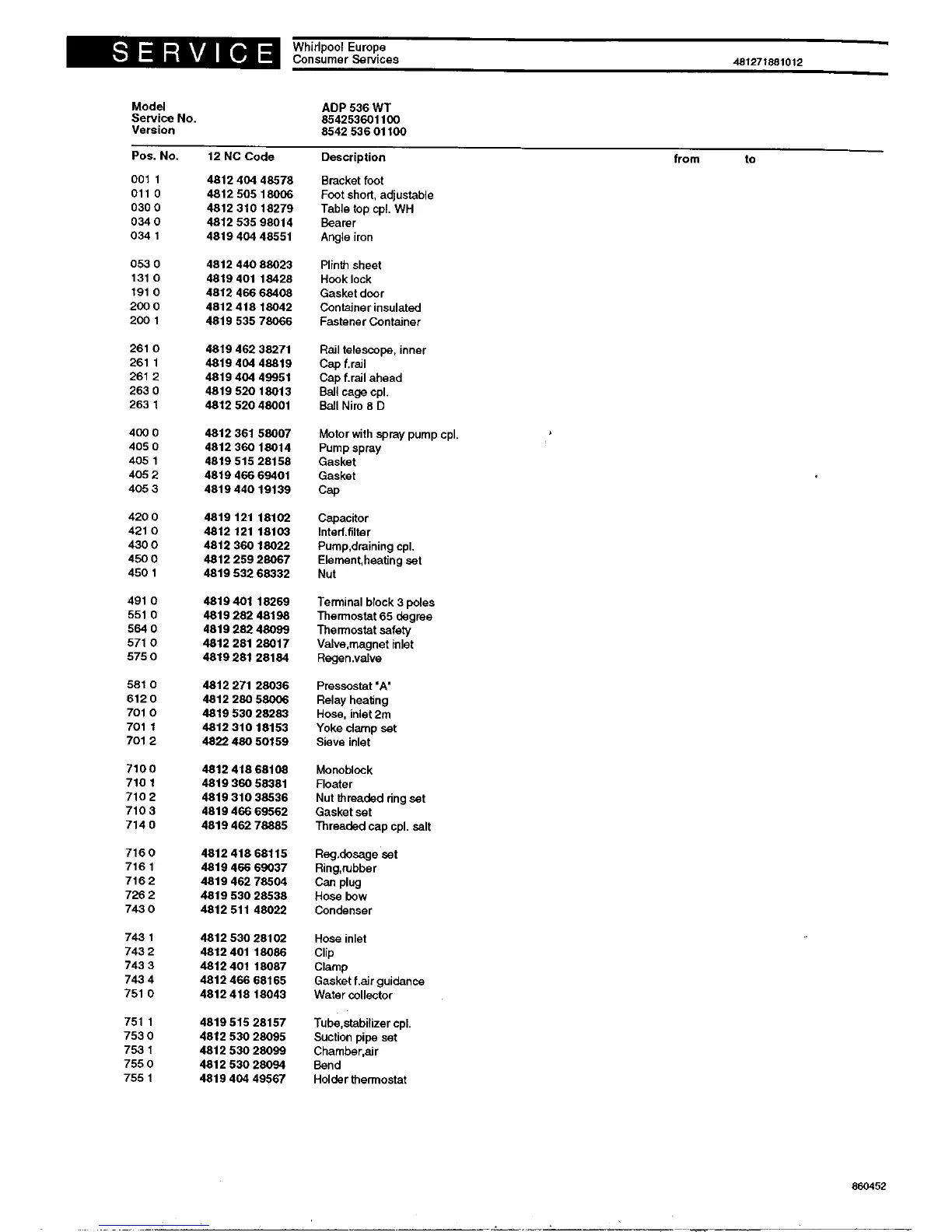 Pos. No. 12 NC Code Description trom to
