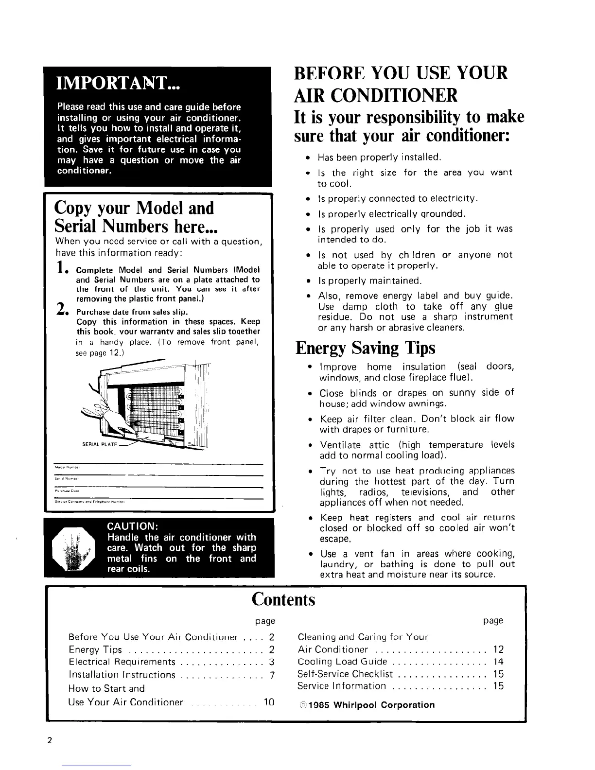Before You Use Your Air Conditioner .... 2 Cleaning and Caring for Your