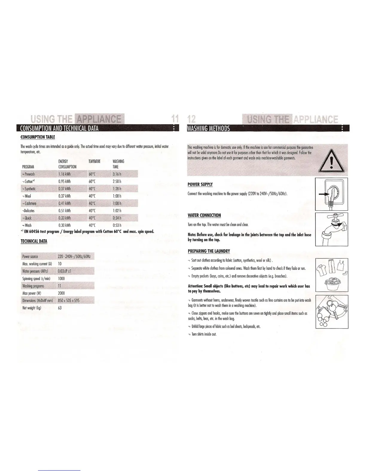 Whirlpool AW06100P - Consumption and Technical Data; Washing Method; Consumption Table; Power Supply