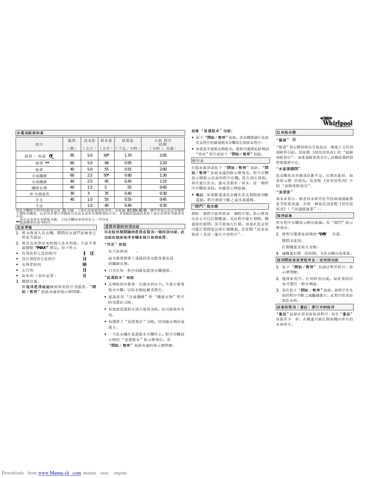 得。由於供水壓力和溫度以及洗衣量和衣物類型的不同,各家庭的能源消耗與上表中的資料可能會