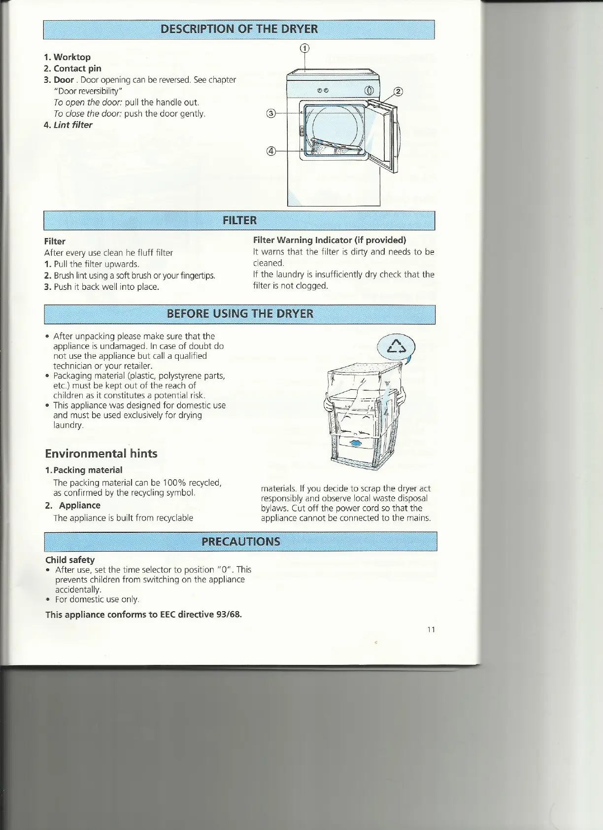 Whirlpool AWZ121 - Dryer Description and Safety; Dryer Components; Filter Maintenance; Pre-Use Checks and Safety