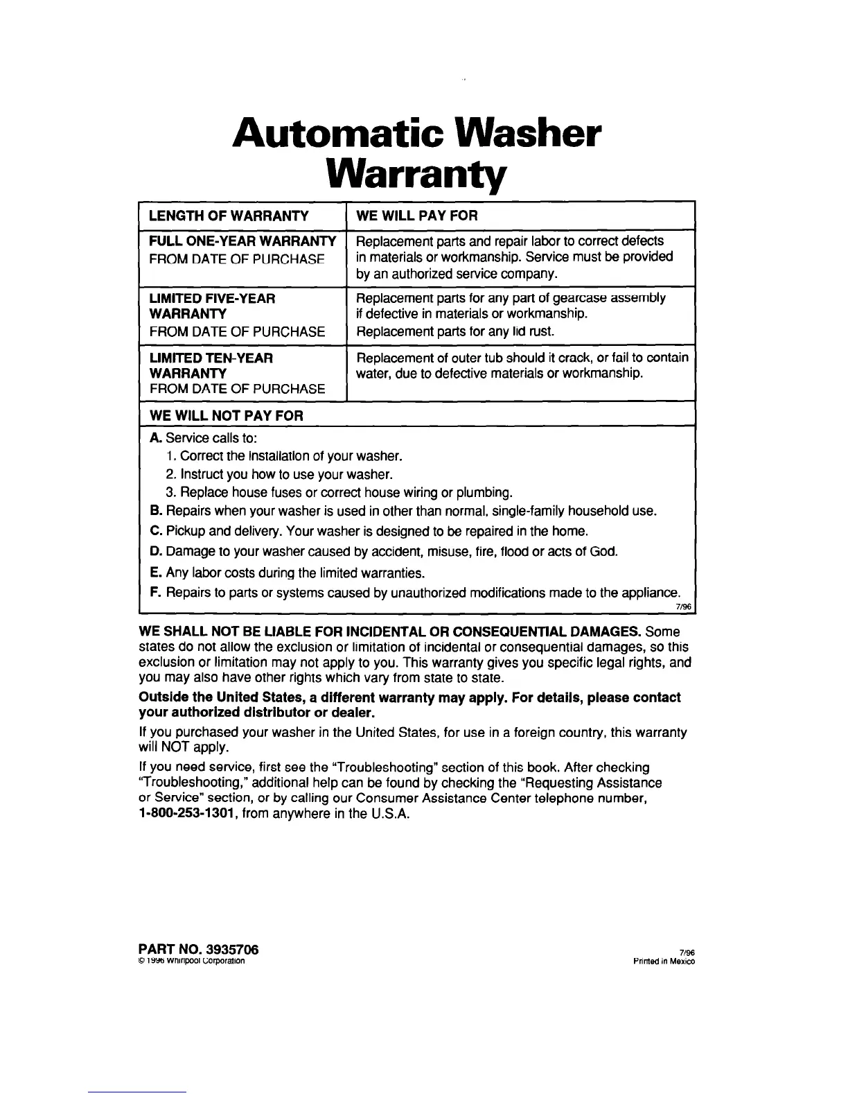 If you purchased your washer in the United States, for use in a foreign country, this warranty