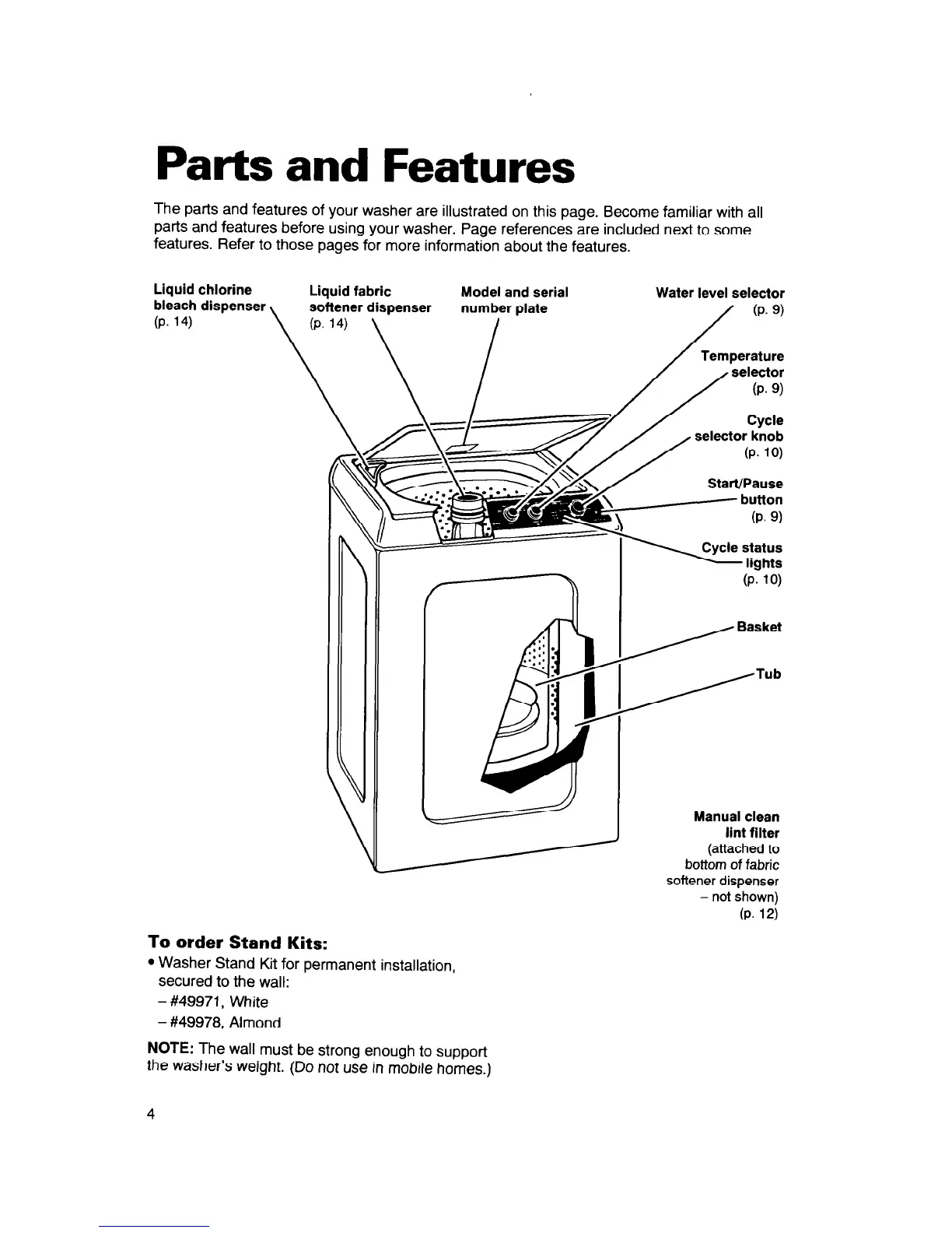 The parts and features of your washer are illustrated on this page. Become familiar with all