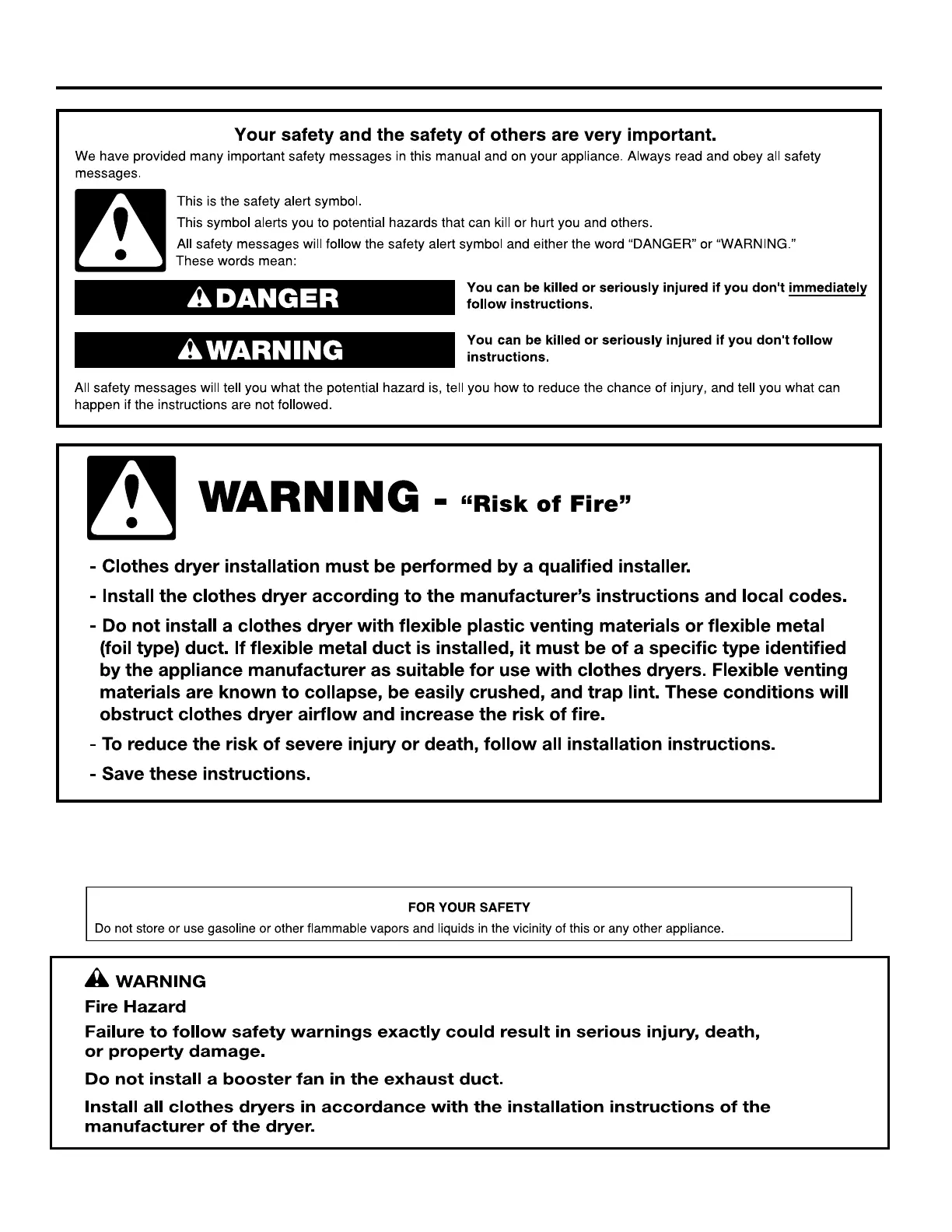Whirlpool CGM2745FQ0 - Dryer Safety; Safety Alert Symbol and Warnings; Risk of Fire Warning; Gas Smell Instructions