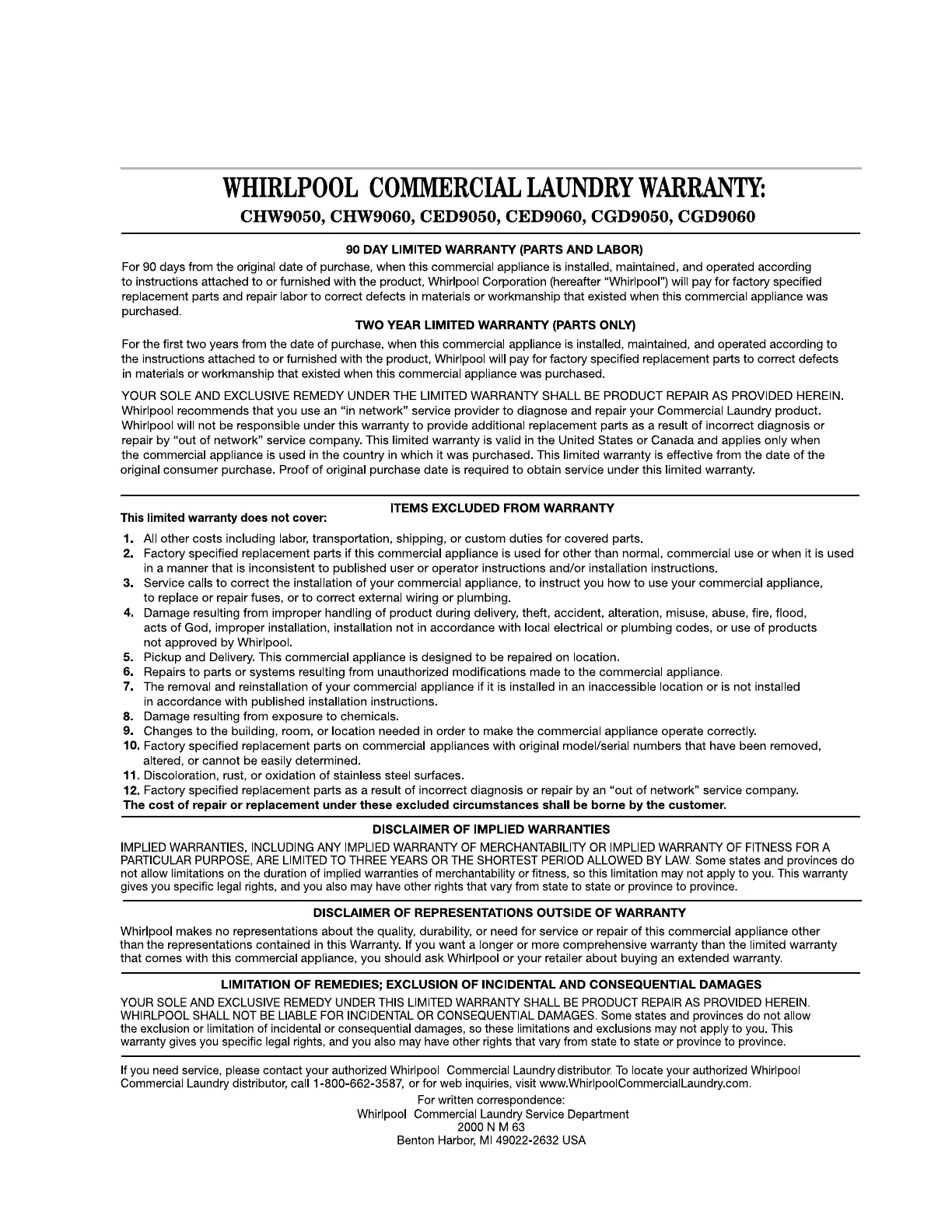 Other manuals for Whirlpool CHW9050