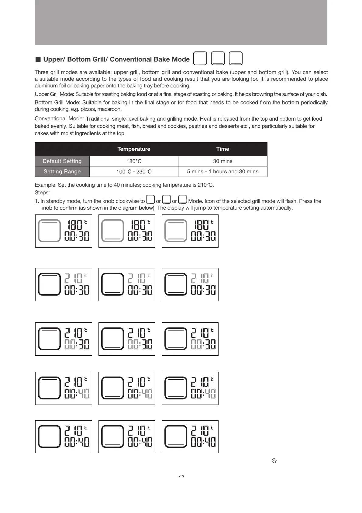 Example: Set the cooking time to 40 minutes; cooking temperature is 210°C.