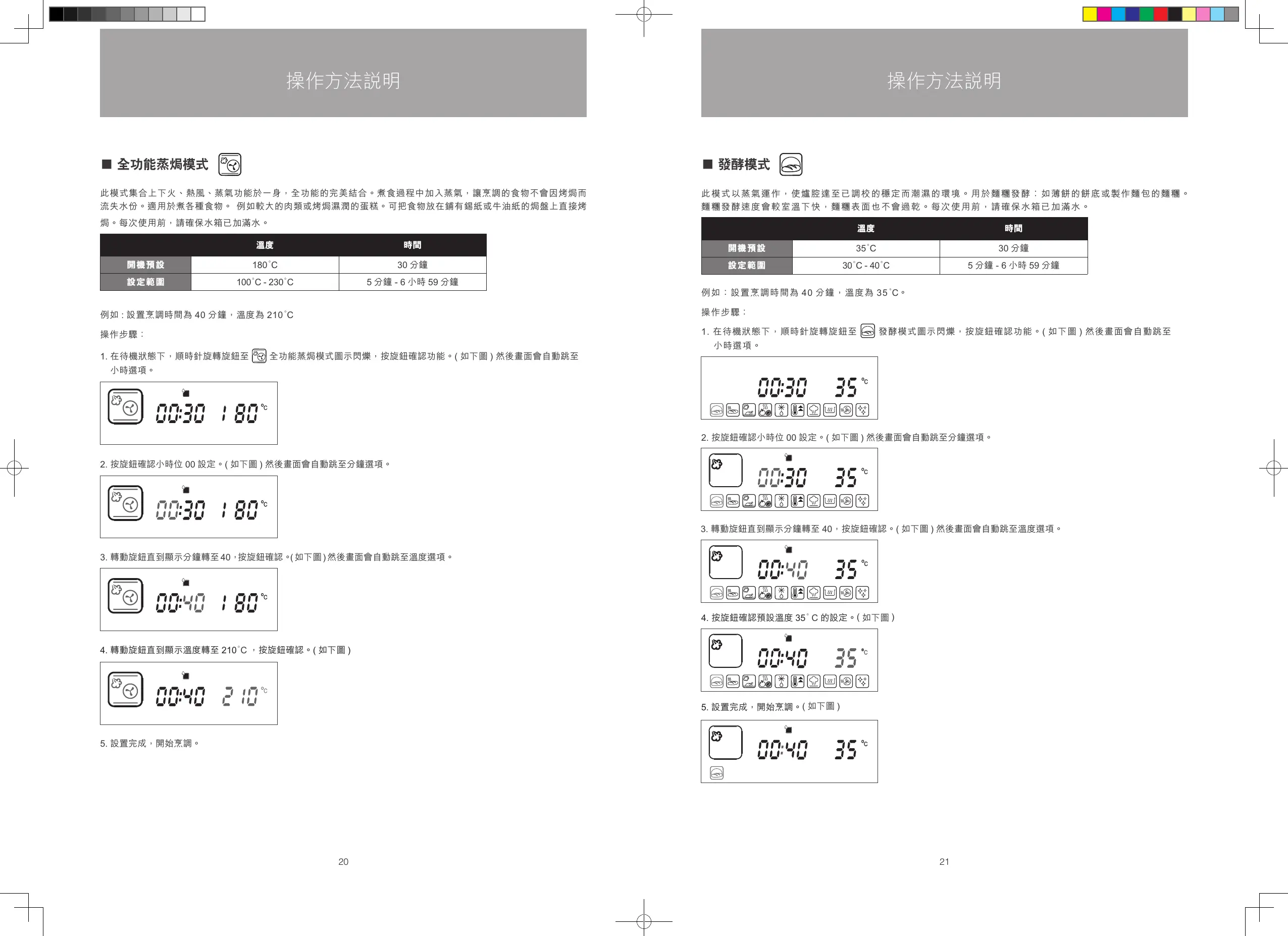 例如:設置烹調時間為 40 分鐘,溫度為 35°C 。