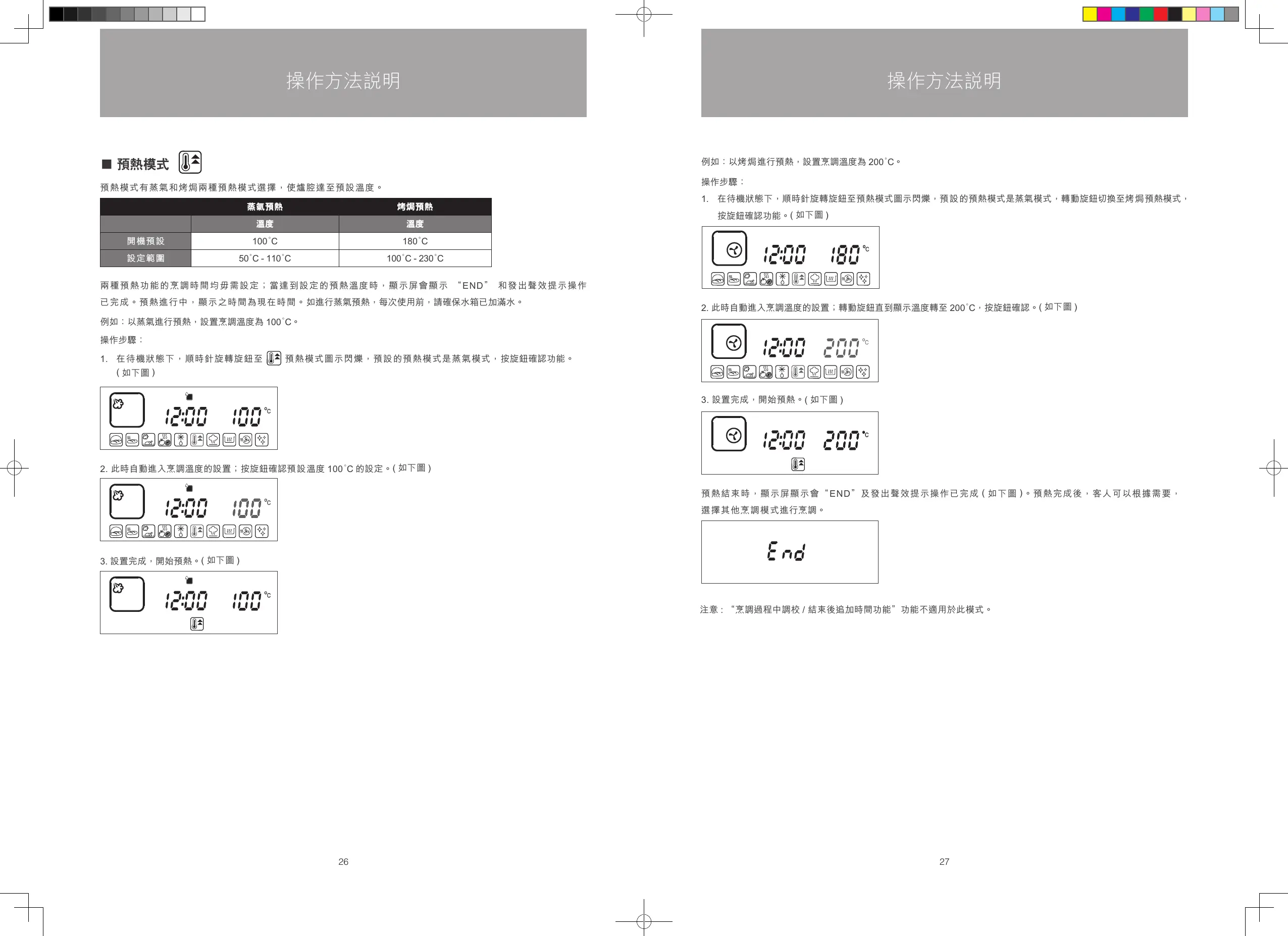 兩種預熱功能的烹調時間均毋需設定;當達到設定的預熱溫度時,顯示屏會顯示“END”和發出聲效提示操作