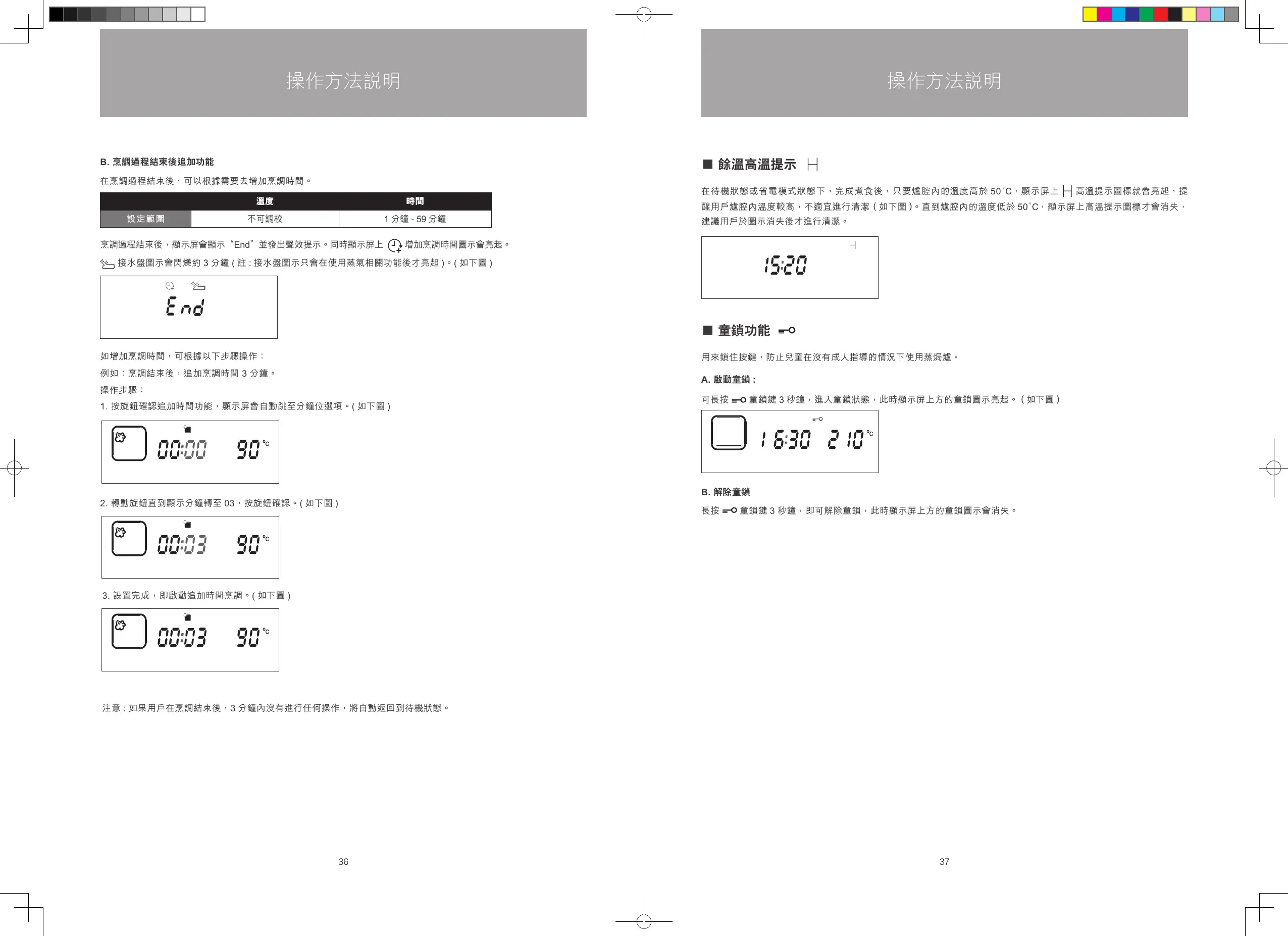 在待機狀態或省電模式狀態下,完成煮食後,只要爐腔內的溫度高於 50°C ,顯示屏上 高溫提示圖標就會亮起,提