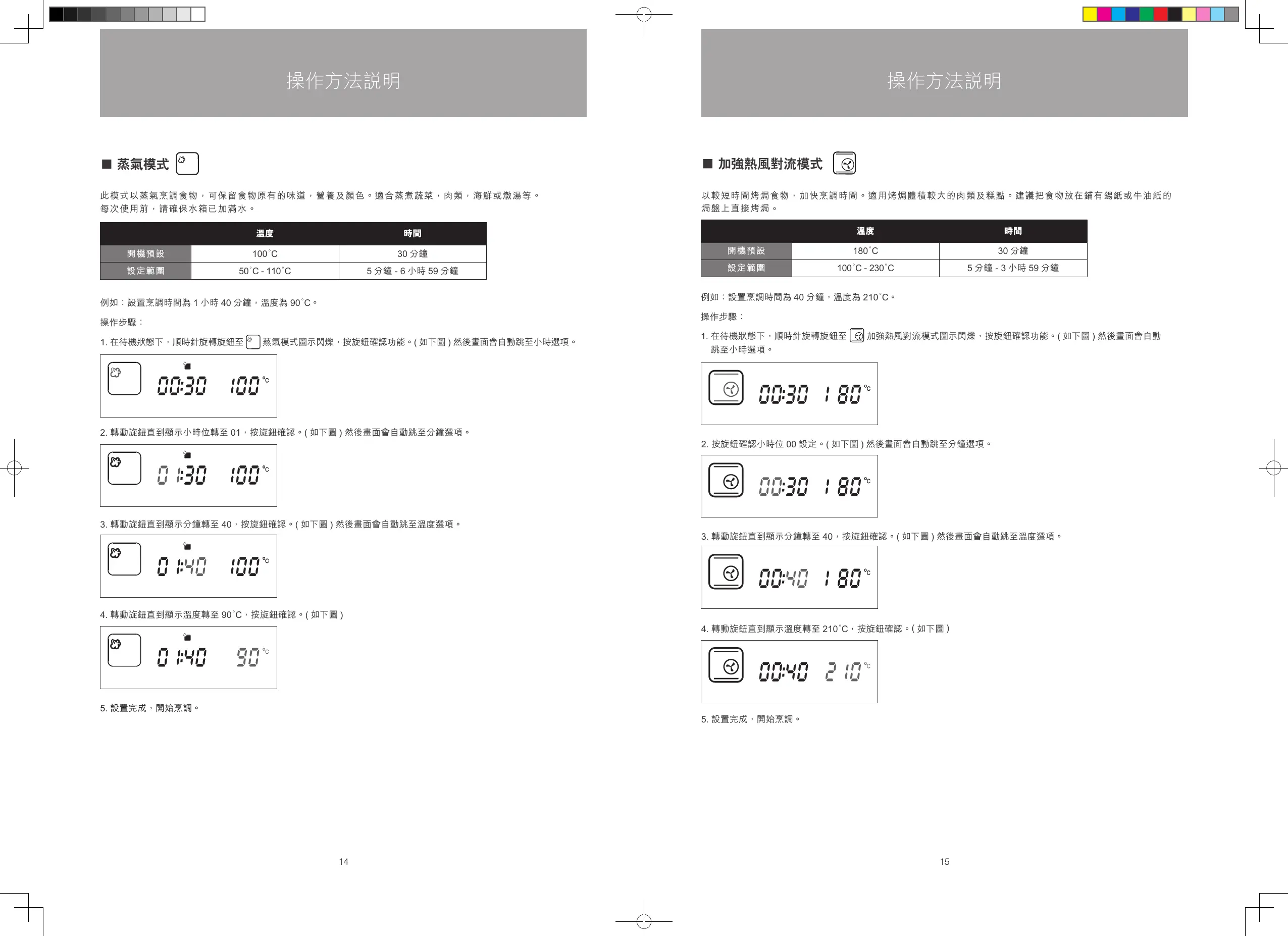 例如:設置烹調時間為 40 分鐘,溫度為 210°C 。
