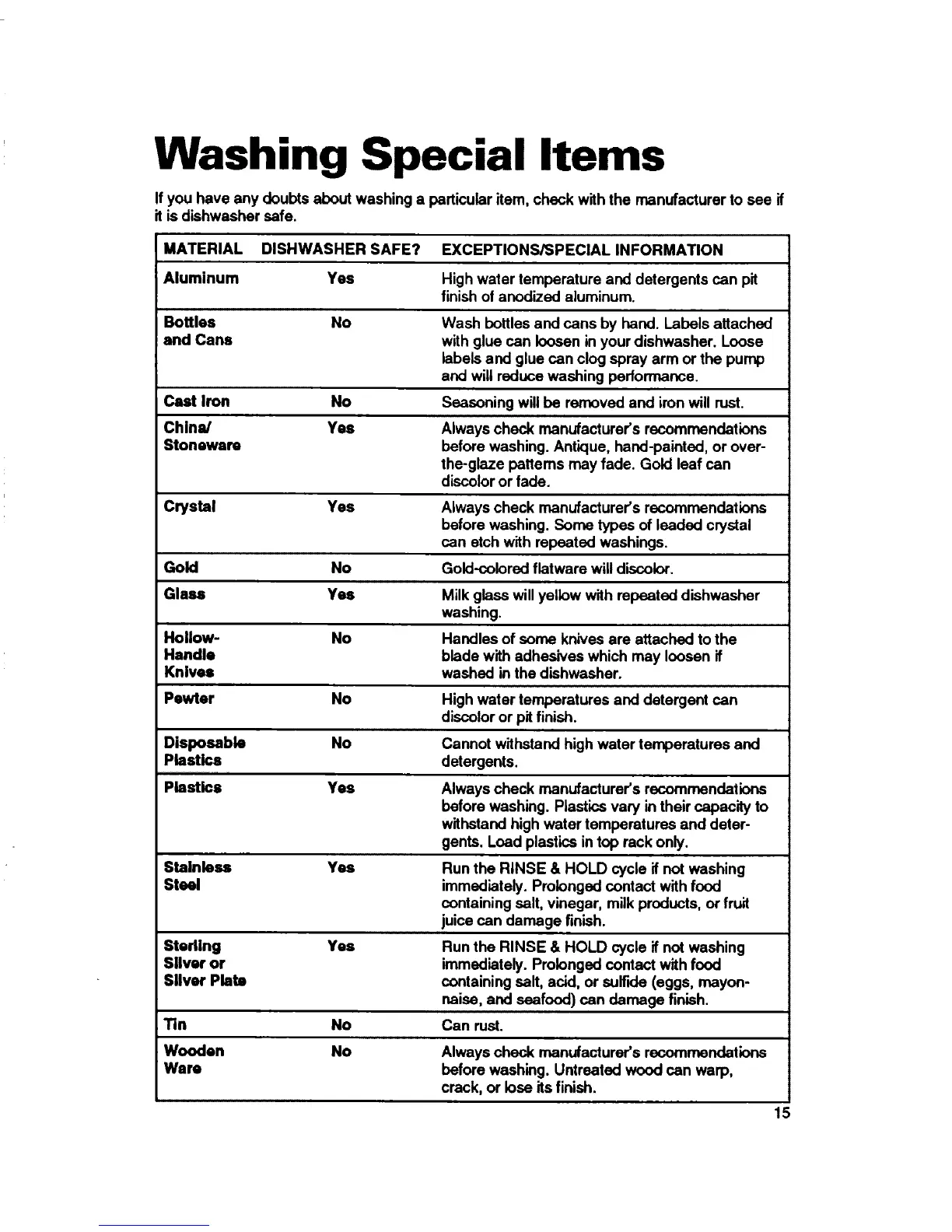 MATERIAL DISHWASHER SAFE? EXCEPTIONS/SPECIAL INFORMATION