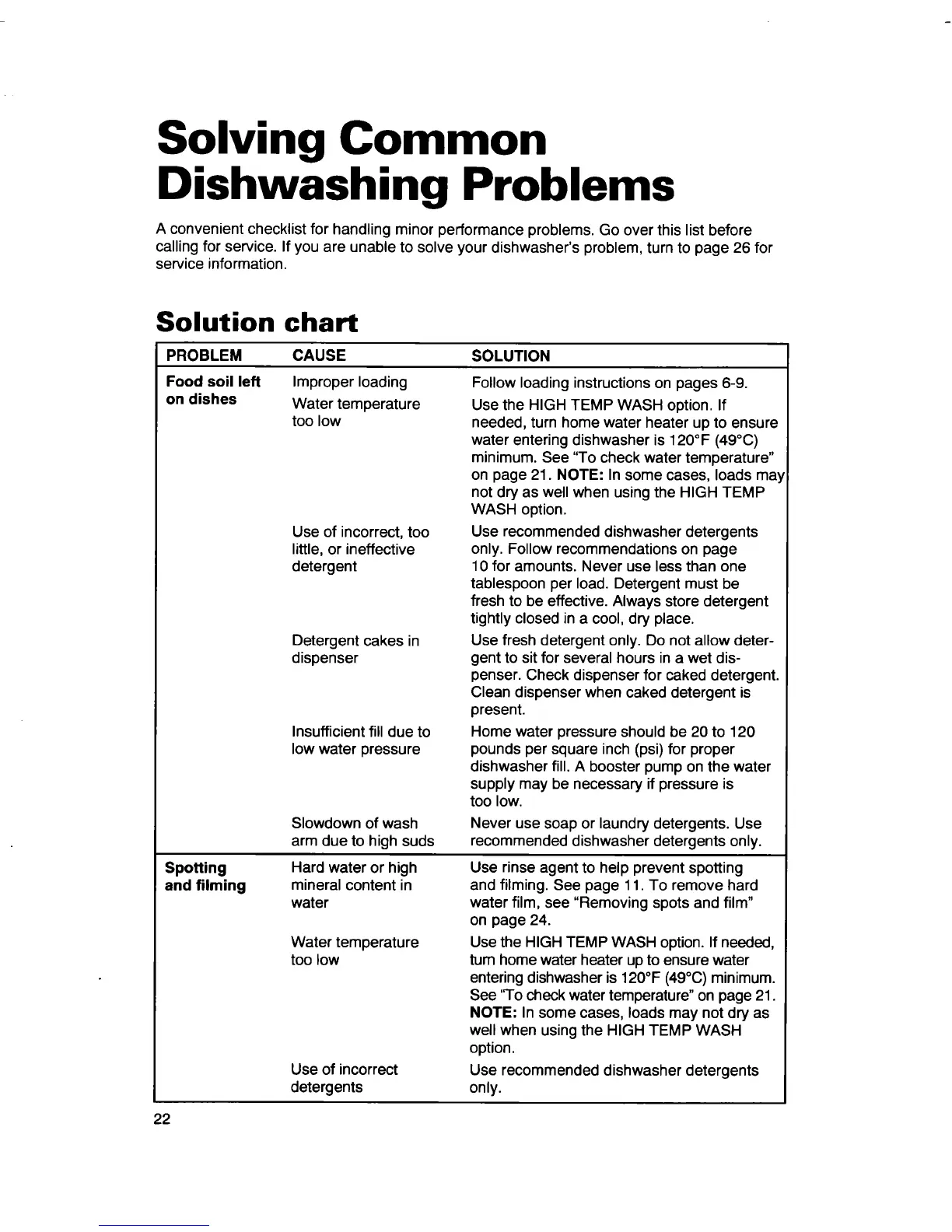 calling for service. If you are unable to solve your dishwasher's problem, turn to page 26 for