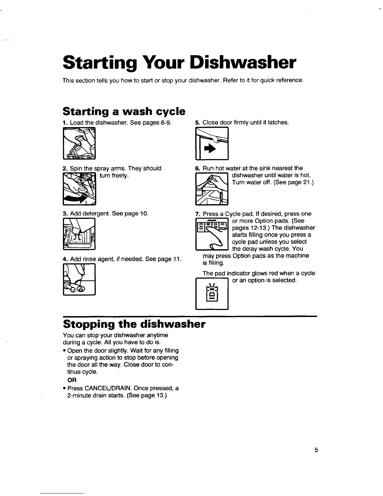 This section tells you how to start or stop your dishwasher. Refer to it for quick reference.