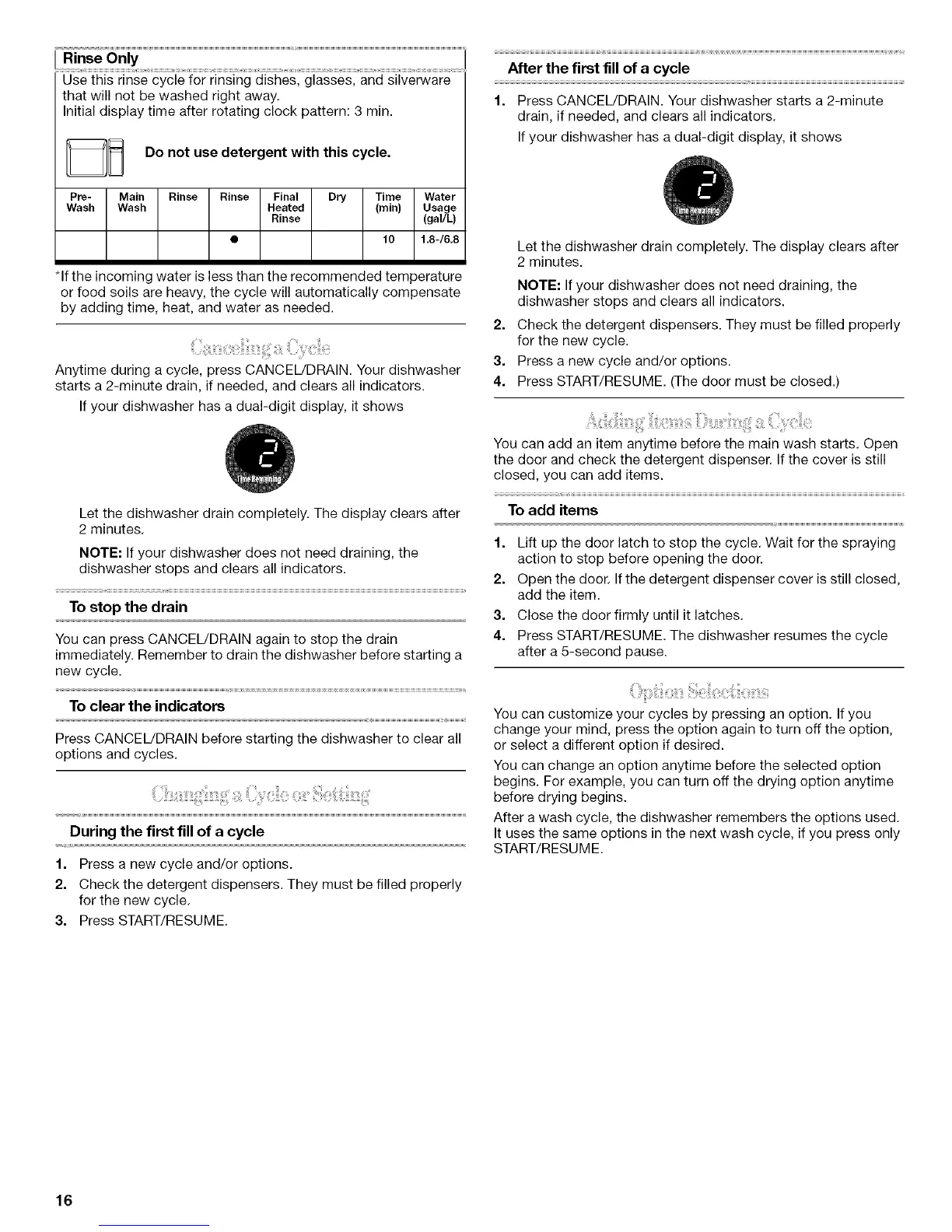 1. Press CANCEL!DRAIN. Your dishwasher starts a 2-minute