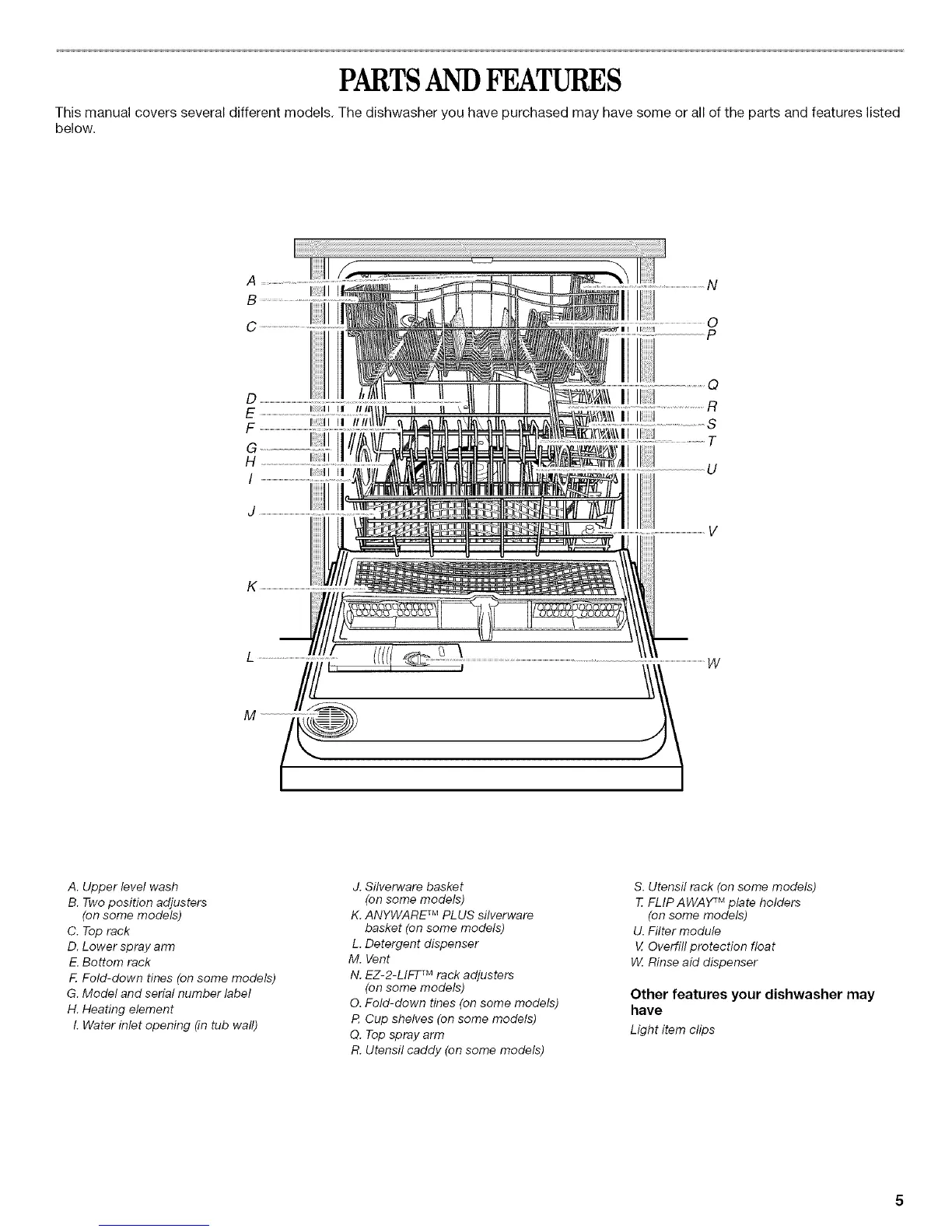 This manual covers several different models. The dishwasher you have purchased may have some or all of the parts and features listed