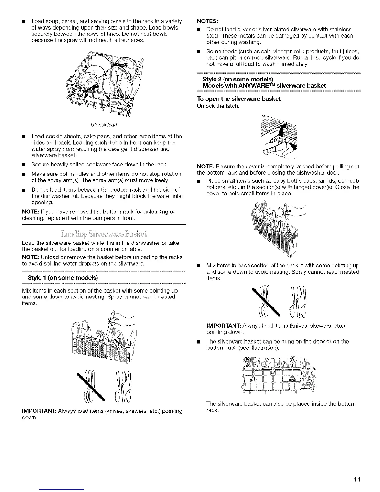 • Do not load silver or silver-plated silverware with stainless