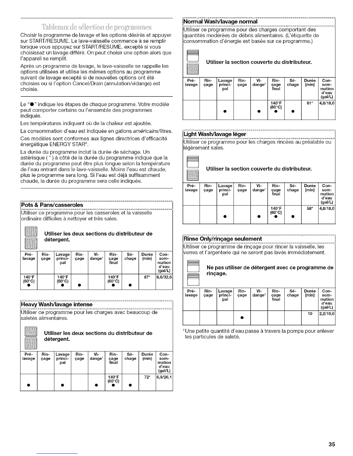 La consommation d'eau est indiquee en gallons am_ricains/litres.