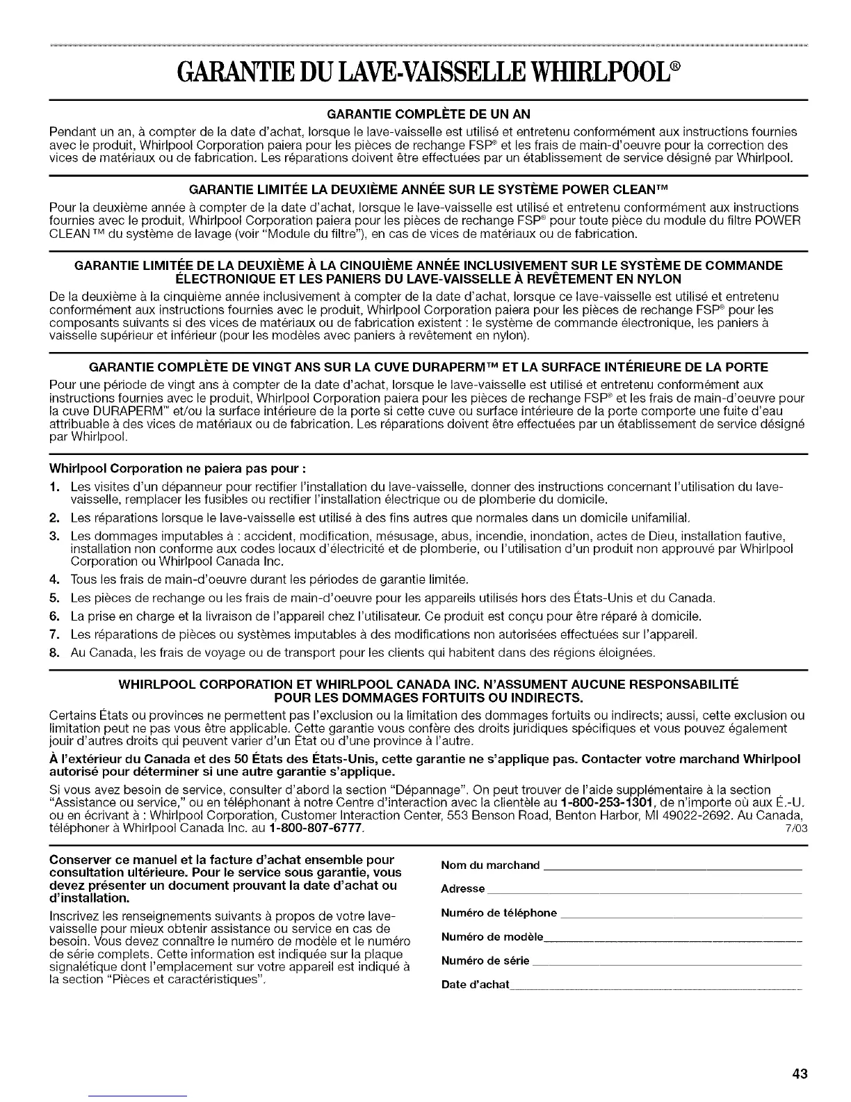 telephoner a Whirlpool Canada Inc. au 1-800-807-6777. 7/03