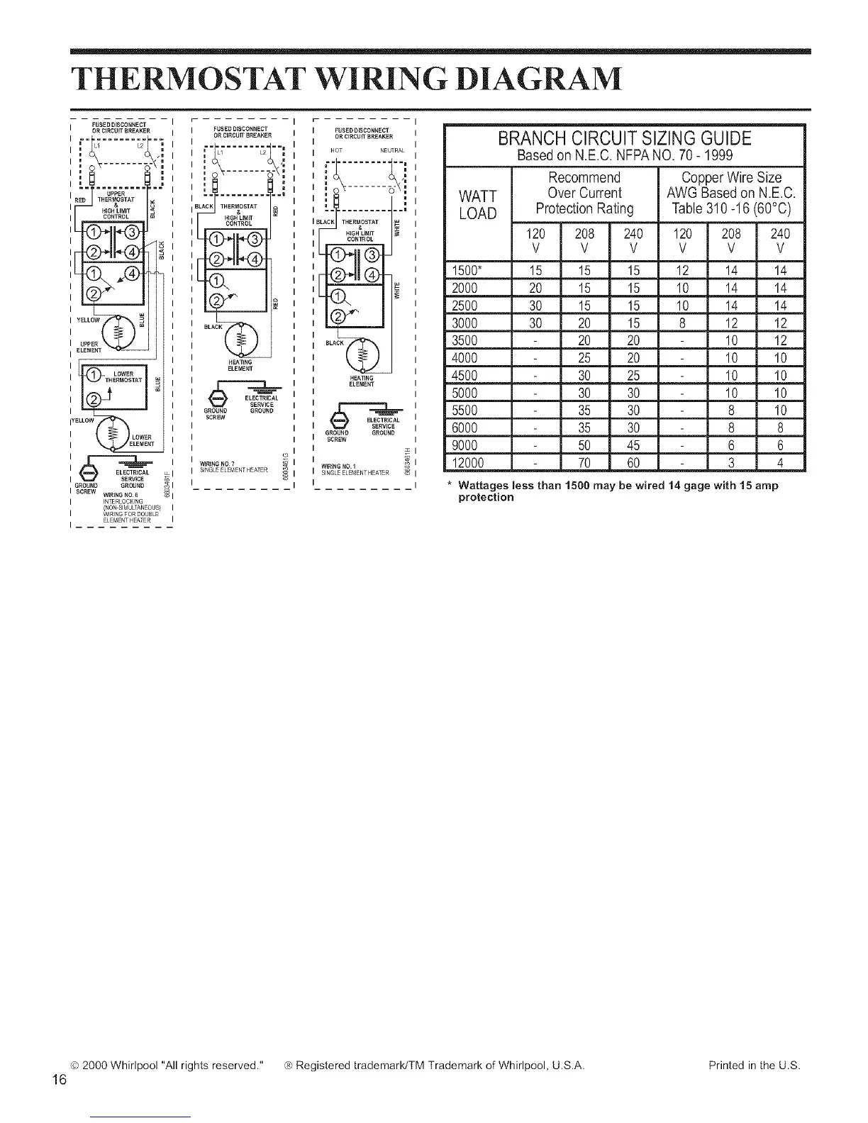 Wattages less than 1500 may be wired 14 gage with 15 amp