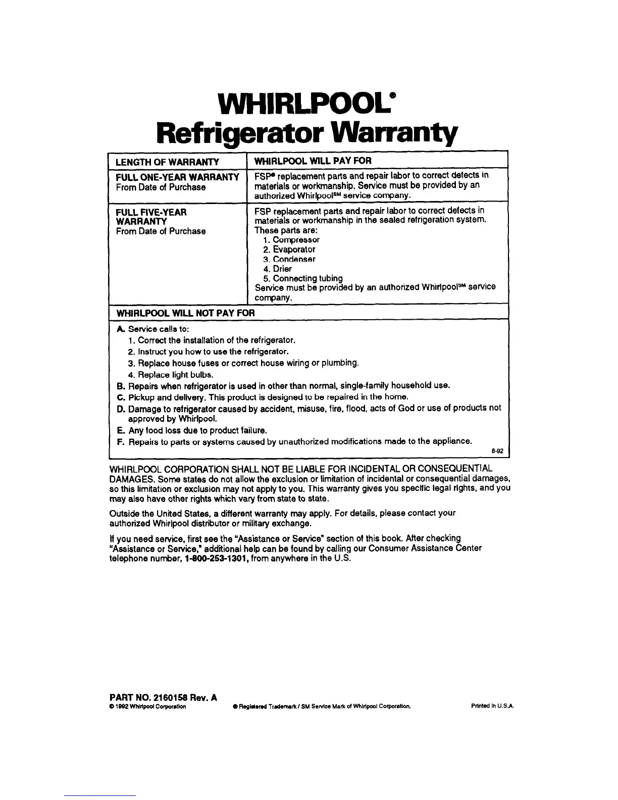 WHIRLPOOL CORPORATION SHALL NOT BE LIABLE FOR INCIDENTAL OR CONSEQUENTIAL