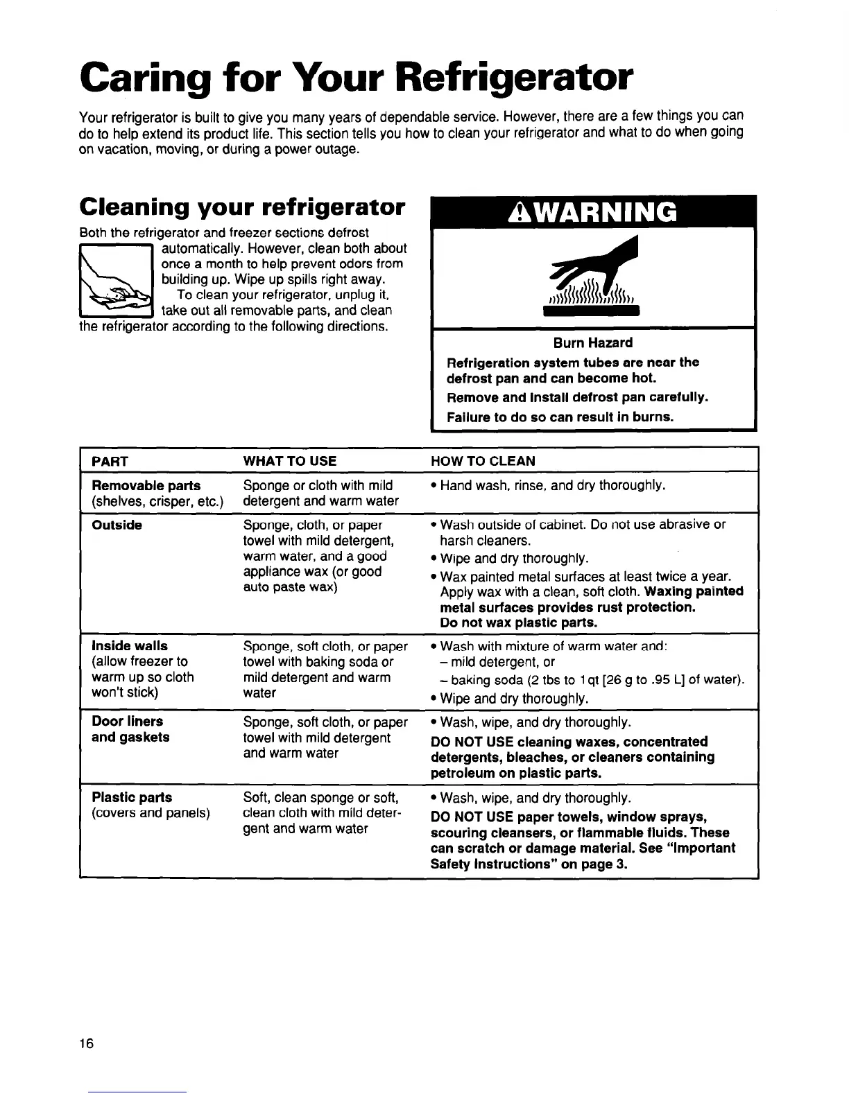do to help extend its product life. This section tells you how to clean your refrigerator and what to do when going